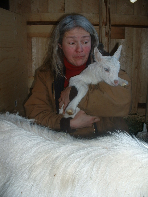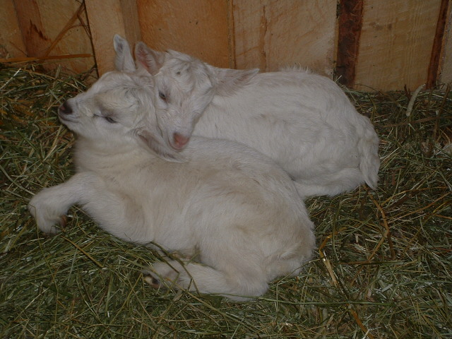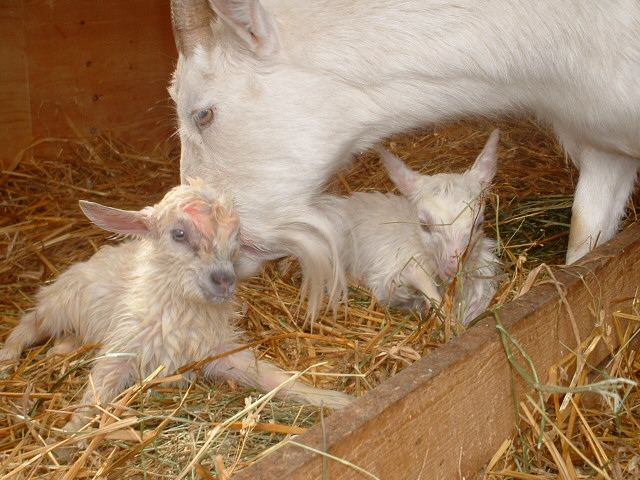 Gereon hatte so seine Hoffnungen auf Zicklein, und diesmal hatte er Recht. Odette, die Gute und Leichtgebaerende, legte problemlos und zuegig innerhalb von 15 Minuten zwei kleine Ziegenmaedels ins Stroh, die nach weiteren 30 Minuten auf den Beinen waren. ![]()