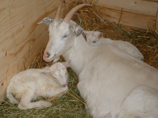 Kaum war ich richtig warm gearbeitet am Samstag, da rief der Herr Hoe. schon an: Ueberraschung!! Nicht die erwartete Woelkchenziege war niedergekommen, sondern kurzerhand hatte sich Mafalda entschlossen, zu entbinden. Sehr tueckisch, hatte sie sich nichts anmerken lassen, bis sie dann lt. Gereon mehr oder weniger ploetzlich anfing zu greinen. Als er guckte, lag sie schon und ein Bein war zu sehen. Also schnell Umzug in den einen noch verfuegbaren Stall, mit ein bisschen Umschichten, und dann gab es zwei weisse Ziegenboeckchen. Geschlechterverhaeltnis ausgeglichen.