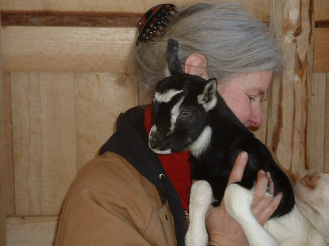 Als ich von der Arbeit kam, war ein Stall bereits aufgeteilt fuer die zu erwartenden Woechnerinnen. Woelkchen machte seltsame Verrenkungen, und so zog sie in die Kueche um. Eigentlich wollten wir essen, aber Woelkchen wollte das nicht. Mit ebenfalls einigem Gegreine und ziemlich langsam legte sie uns ein weiteres weisses Boeckchen ins Stroh. Ziemlich gross sogar, obwohl die Woelkchenziege gar nicht so dick war und sowieso so knochig, dass wir schon Sorge hatten, die Geburt wuerde sie total schaffen. Aber als das Kind erst mal da war, schien sie doch noch recht fit. Wir wollten essen, endlich. Gerade wollte ich die Teller fuellen, da kam ein Geraeusch, Gereon guckte, und wieder Ueberraschung: Noch ein Zicklein – aus dieser duennen Ziege. Und diesmal Farbe! Es kam Orca, der Killerwal, natuerlich schon wieder ein Boeckchen.