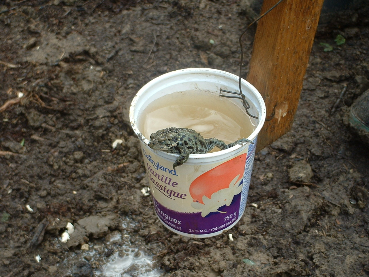 und wegen des hohen Wasserstandes mussten die Bohrloecher ausgeschoepft werden. Dabei entdeckten wir in zwei Schoepfschichten 9 Kroeten, 6 davon an einem Tag. Gleich bei Sichtung der ersten hat Gereon einen Kroetenretter gebaut: