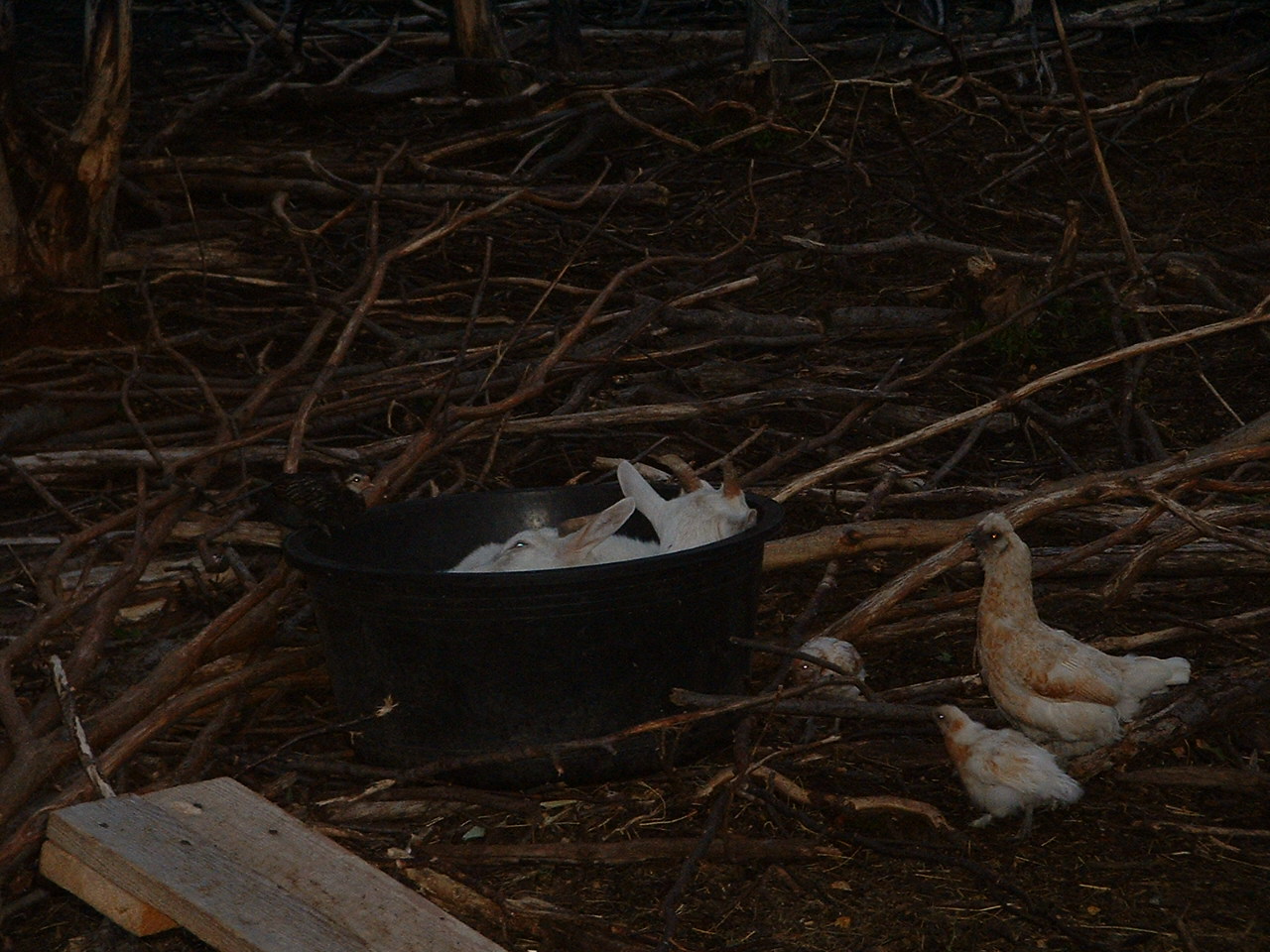 Was man sehen koennte, wenn das Bild heller waere, sind Griselda und Blanka, die in einem Beton/Wasser-Kuebel uebernachtet haben und die am fruehen Morgen schon von Huehnchen auf der Suche nach Moskitos besucht werden. Symbiose.