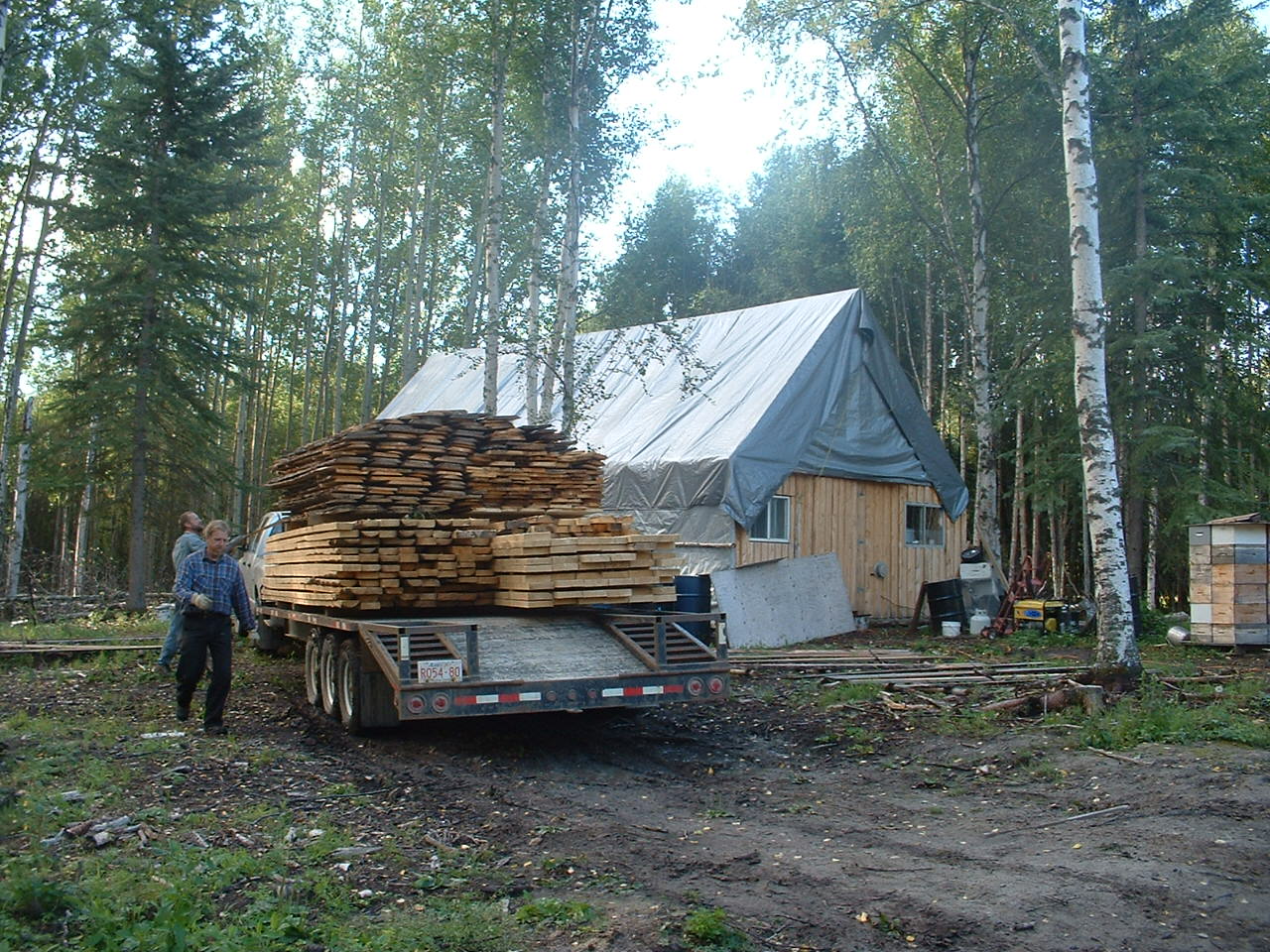 Einmal gut, dass diese Martha eine so liebe Freundin ist. Dann hat Gereon endlich Bauholz bestellt, d.h. nachbestellt. Wir erinnern uns: Voriges Jahr hatten wir ja schon mal hohe Stapel liegen, aber das ist in der Zwischenzeit ja in einige andere Projekte gegangen, wie das halt so noetig war. Arvid kam also mit dickem Truck und Riesenanhaenger und fuhr kuehn und mutig bis vor das Poleshed