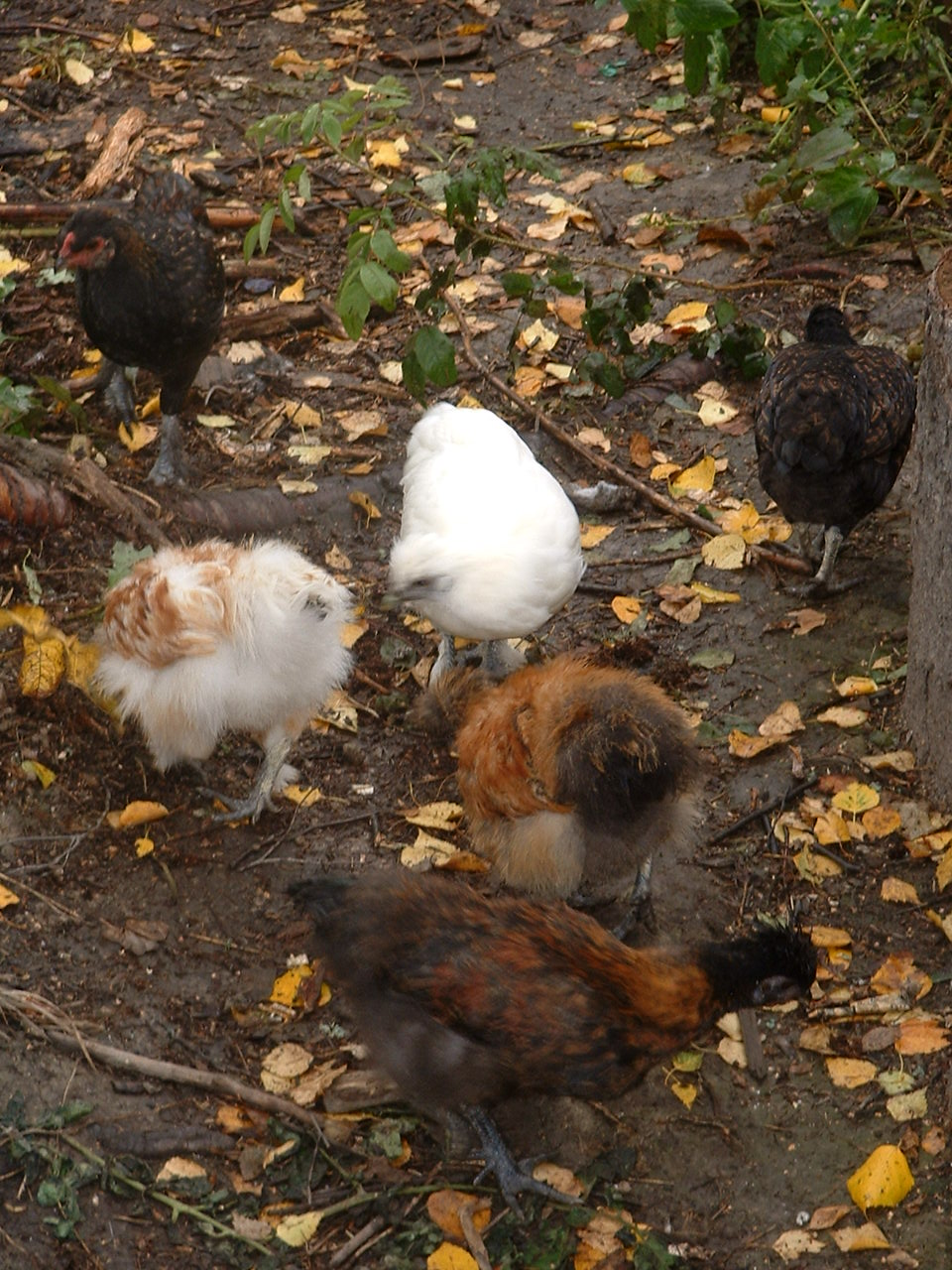 Diese Bilder sind inzwischen Geschichte, weil naemlich der kleine Karl-Heinz, kuehn und mutig, wie weisse Seidenhaehne zu sein scheinen, sich dem Feind, einem Goshawk (Habicht) in den Weg gestellt zu haben scheint. Jedenfalls kam Gereon hinzu, als der Habicht den Karl-Heinz schon gemeuchelt hatte. Es ergab sich, das Gereon ihn gleich rachen konnte. Die Huehner sind seitdem ziemlich verstoert und verschwinden immer mal halbstundenweise unter saemtlichen Gebaeuden. Und der naechste Raubvogel fliegt schon rum. Tja, so isses. Unsere Huehner uebrigens sind hoechst huebsch und interessant. ![]()