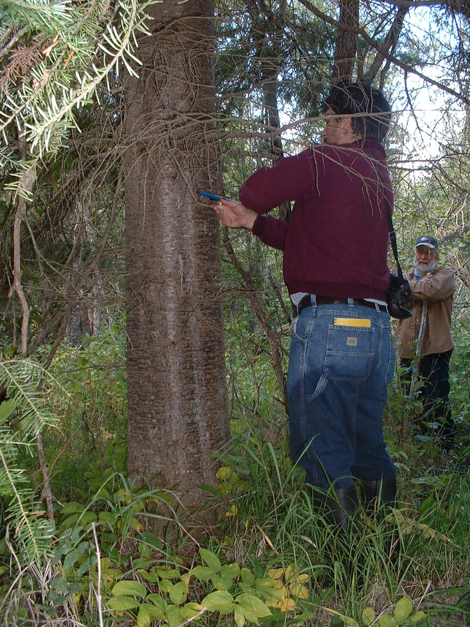 Hier, wo Doug eine dicke Balsamtanne anbohrt, kann man an seiner Hose sehen, wie tief das Wasser war – und es war frisch. Keiner hatte trockene Fuesse, und die meisten mussten ihre Gummistiefel auskippen. Wir hatten viel Spass!!!