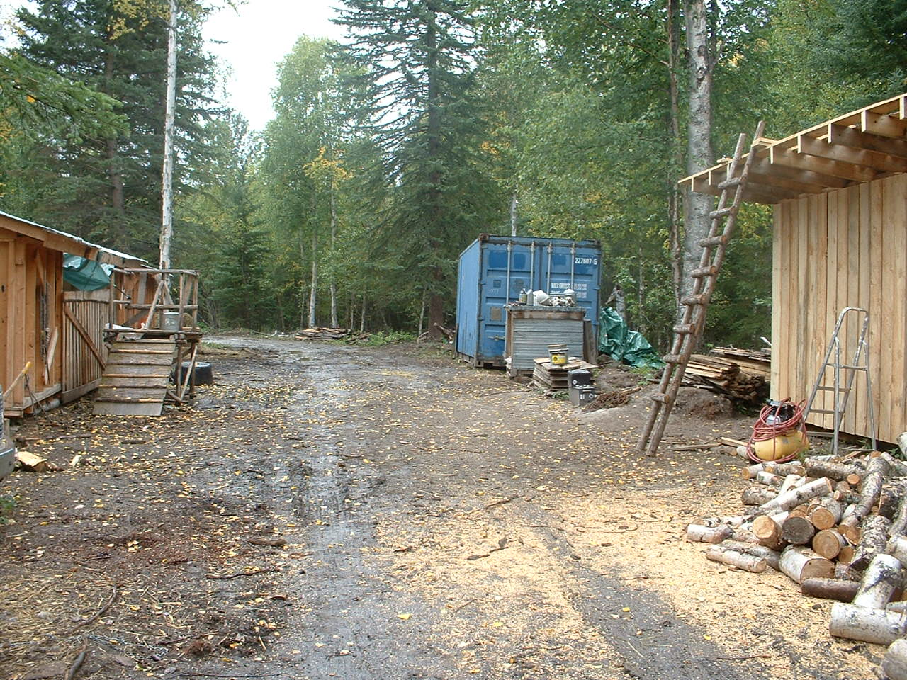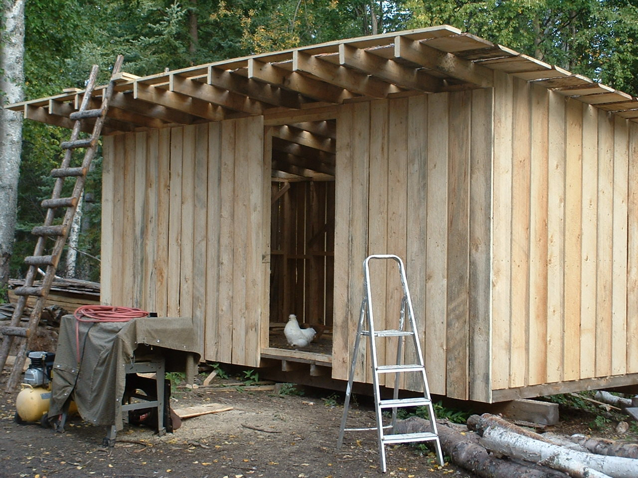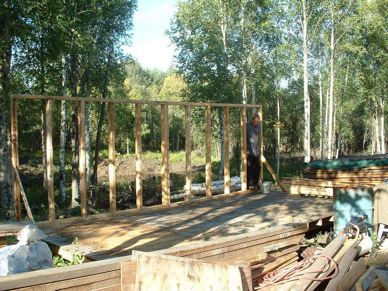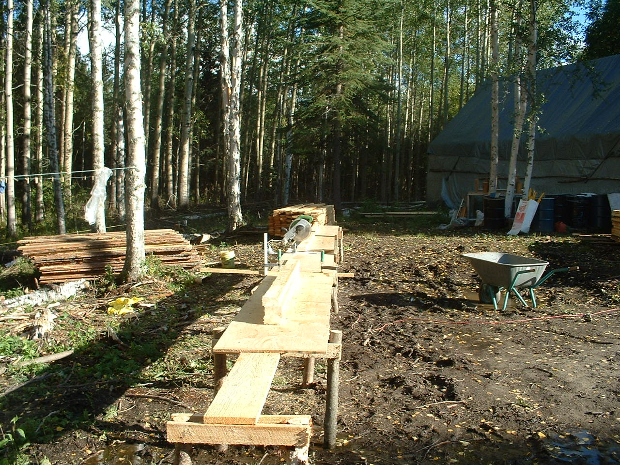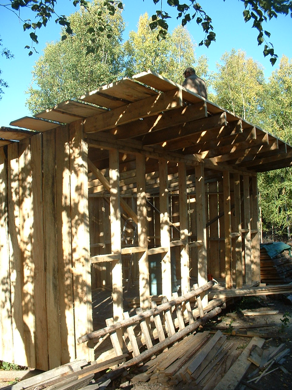Wenn er nicht Schotter verteilte, hat er an unserem Holzschuppen weitergebaut. Dafuer und fuer das zu errichtende Haus wurde erst mal eine Spezial-Werkbank konstruiert.