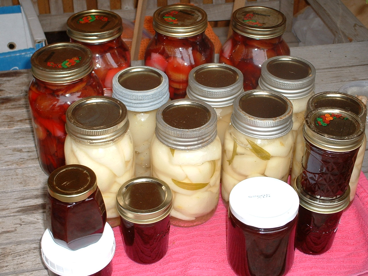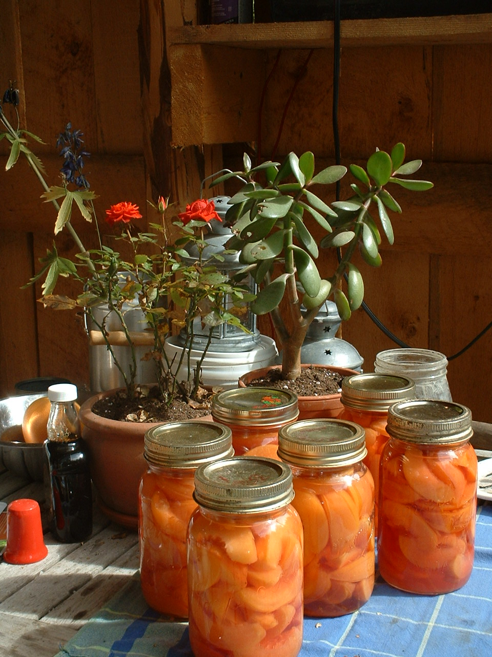 Nachbarin Margaret hat mich sozusagen angefuettert, als sie mir begeistert die Vorzuege von kleinen Aprikosen fuer das Einmachen schilderte. Also machte ich Aprikosen ein, unter unseren etwas erschwerten Bedingungen, und war hin und futsch, schon alleine, weil die so huebsch aussehen. Dann noch Himbeeren, die ich mit Margaret gepflueckt habe. Und noch Nektarinen.