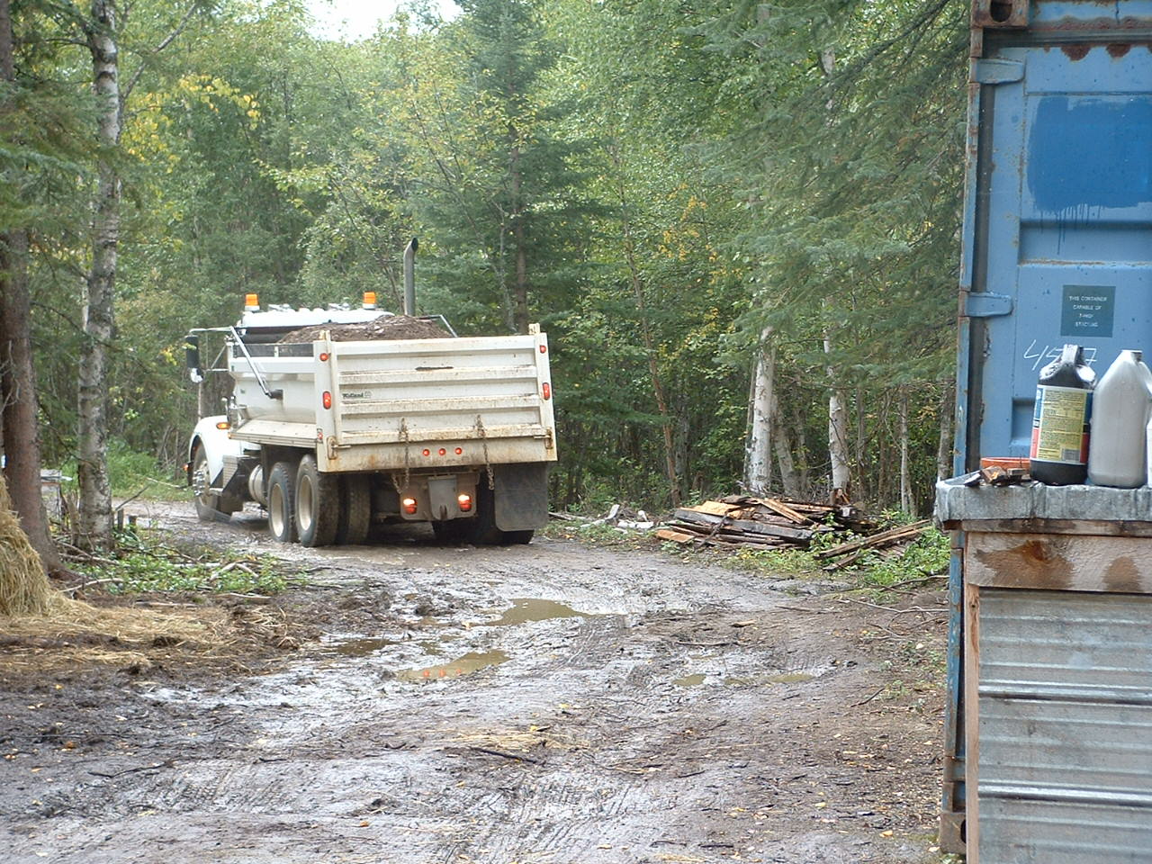 Dann flugs abgeladen, und dann wollte er wieder raus. Da war aber die Matsche vor! Ich waere glaube ich in Traenen ausgebrochen und haette alles verlassen, Auto, Anhaenger, Baustelle. Doch mit zig-mal hin und her und viel Geduld kam Arvid schliesslich wieder raus, wir haben nun noch ein paar mehr tiefe Loecher. Also war klar, es muss jetzt was getan werden, vor allem im vorderen Teil der Einfahrt. Schotter wurde bestellt und kam auch prompt. Leider fing es gerade mal an zu regnen. Die Einfahrt ohne Schotter