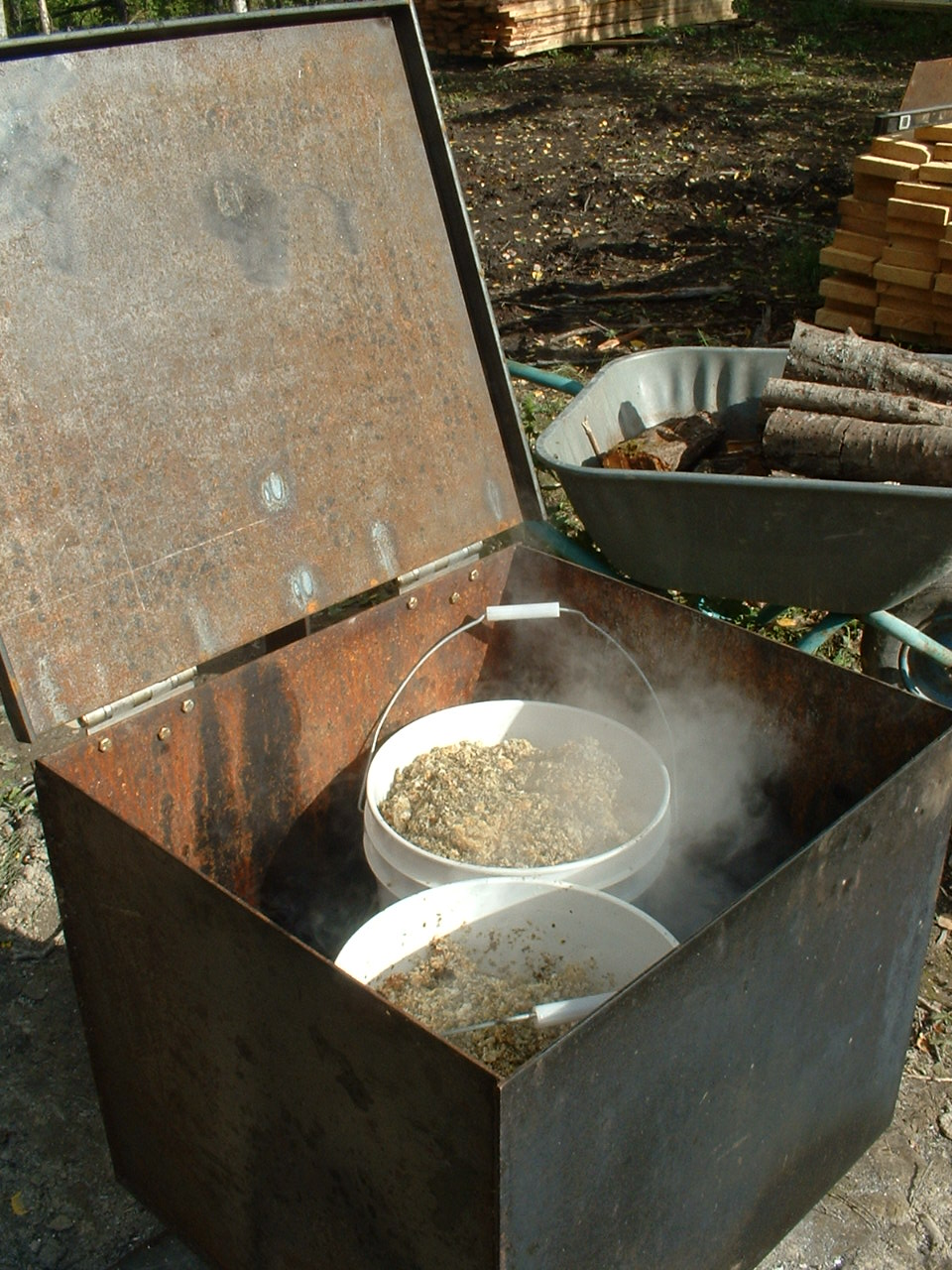 Ach, und wenn er nicht baut oder Haehne raecht, dann schmilzt er auch noch Wachs, der Chef. Hat einen Heavy-Duty-Wachsofen gebaut,