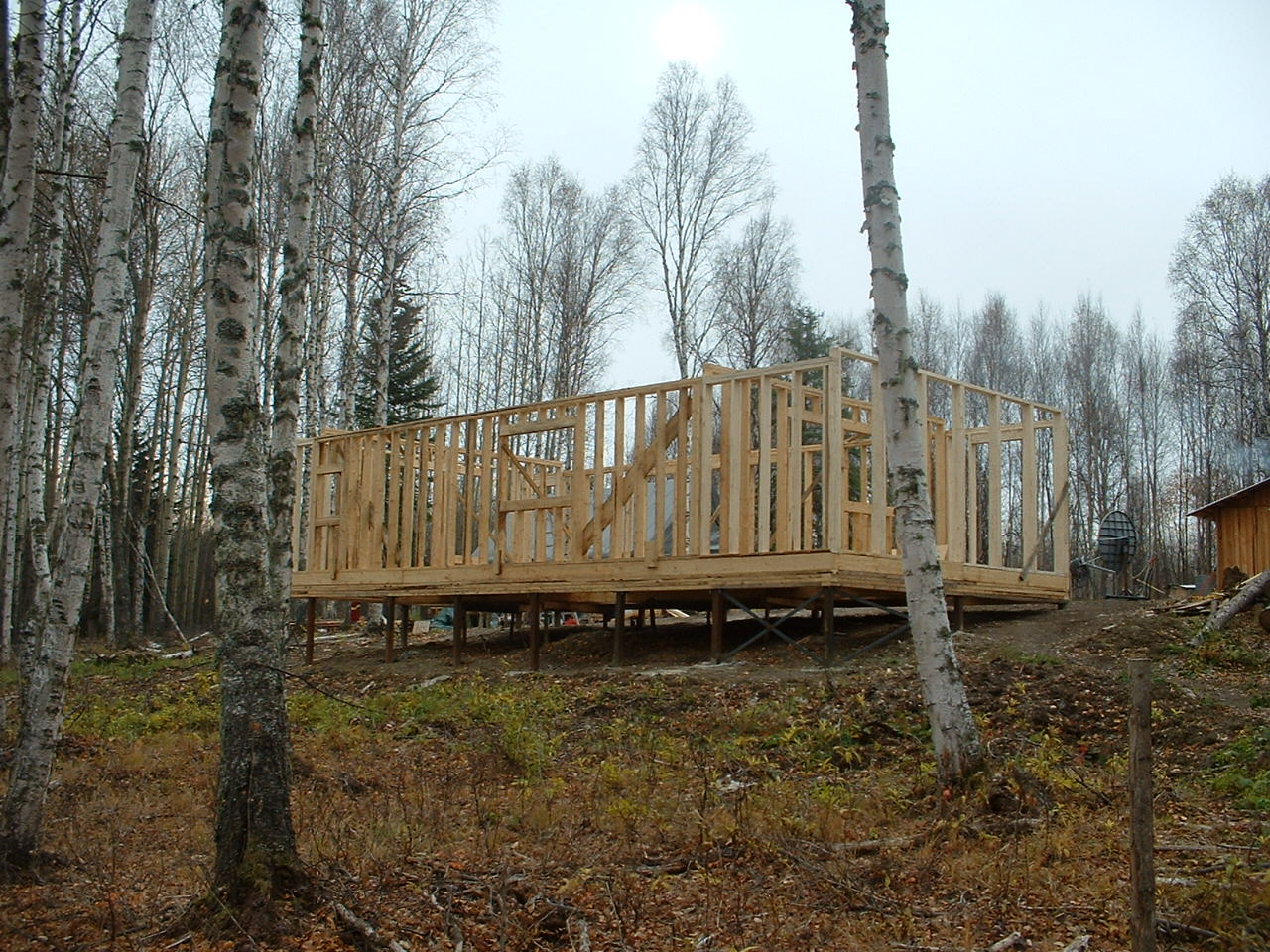 Derweil zeichnet Gereon die schwierigen Bauteile auf, z.B. die Treppe. Alles aber nur sehr rudimentaer, der ganze Rest ist in seinem Kopf, hoffentlich… Nun sind aufgrund des Holzkaeferproblems in B.C. und des zusammenbrechenden Wohnungsmarktes in den USA die Holzpreise hier heftig gesunken, was fuer uns nicht schlecht ist. So wird wohl doch in absehbarer Zeit das ganze Kistchen mit Sperrholz verkleidet und erst spaeter mit huebschen Brettern versehen werden. Sperrholz geht schnell und stabilisiert, sagt der Architekt. Der heute jagen ist, mit Norwin, dem Jungjaeger. Ich hab da ja immer gemischte Gefuehle, wisst ihr ja.