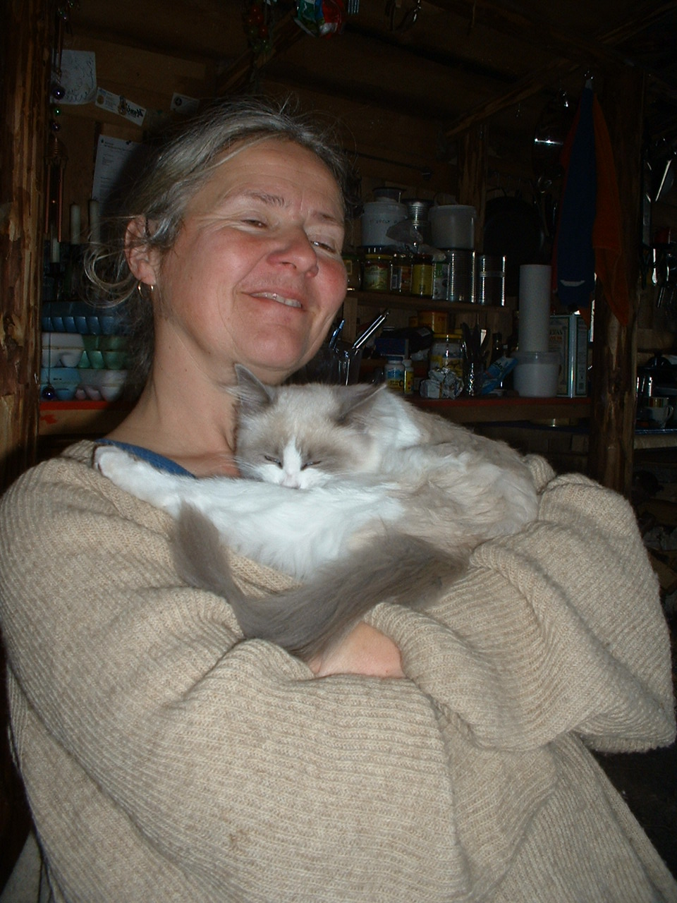 Dieses letzte hier ist die Ansicht vom Teich aus, ich finde, das macht doch was her, oder? Natuerlich mache ich mir inzwischen Gedanken, ob wirklich genuegend Fenster eingeplant sind. Drei grosse auf der Suedseite, aber dann wird das grosse auf der Westseite ja von der inzwischen eingeholzten Veranda und dem darueberliegenden Serenaden-Balkon etwas beschattet. Doch im Herbst und Winter steht die Sonne tief, da kriege ich sicher noch Licht in die Kueche. Und im Sommer bin ich eh draussen. Fuer die Ostseite gilt es aehnlich. Nach Norden haben wir ein relativ grosses Fenster ueber dem Esstisch geplant, und dann natuerlich eines fuer das WC ohne W, stattdessen mit SP (steht fuer Spaene). Trudy und ich sitzen gern schon mal in der Verandatuer… Trudy liegt auch gern auf mir drauf, wo immer Platz ist…