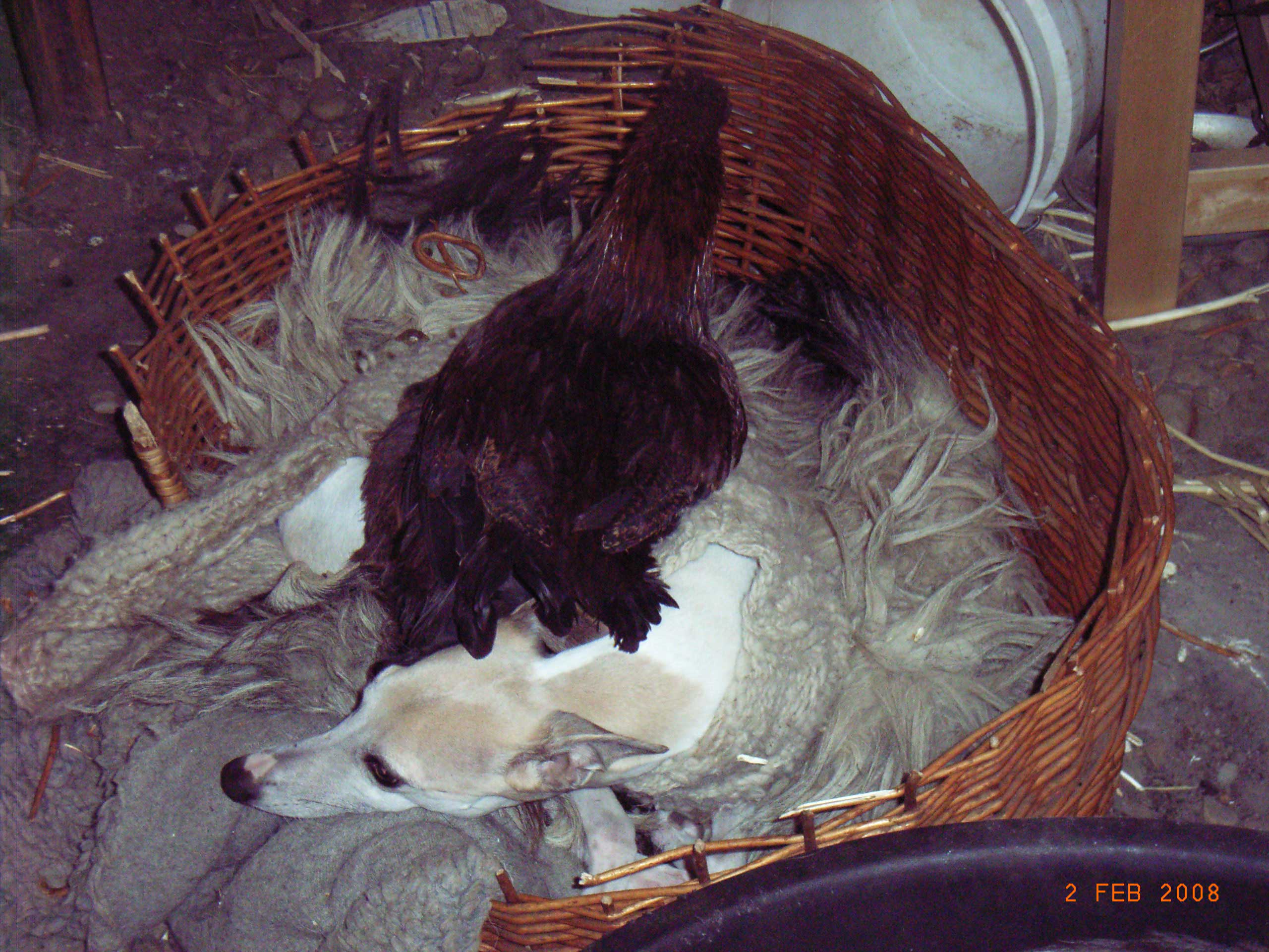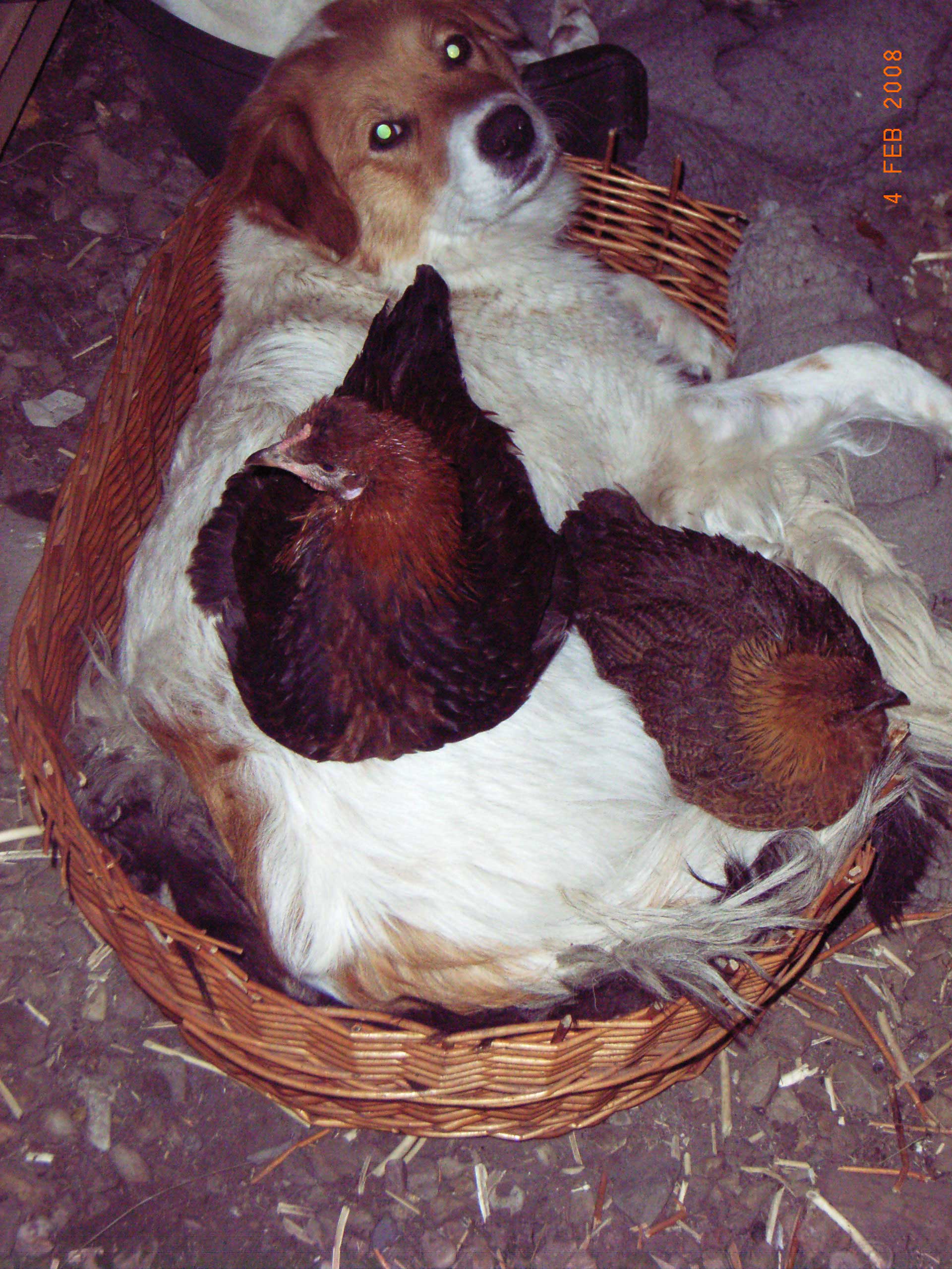 Die Hunde sind wahrscheinlich froh, weil nun die Huehner wieder aus der Kueche verbannt sind. Man hatte sich allerdings ziemlich friedlich arrangiert, wie die Bilder zeigen.