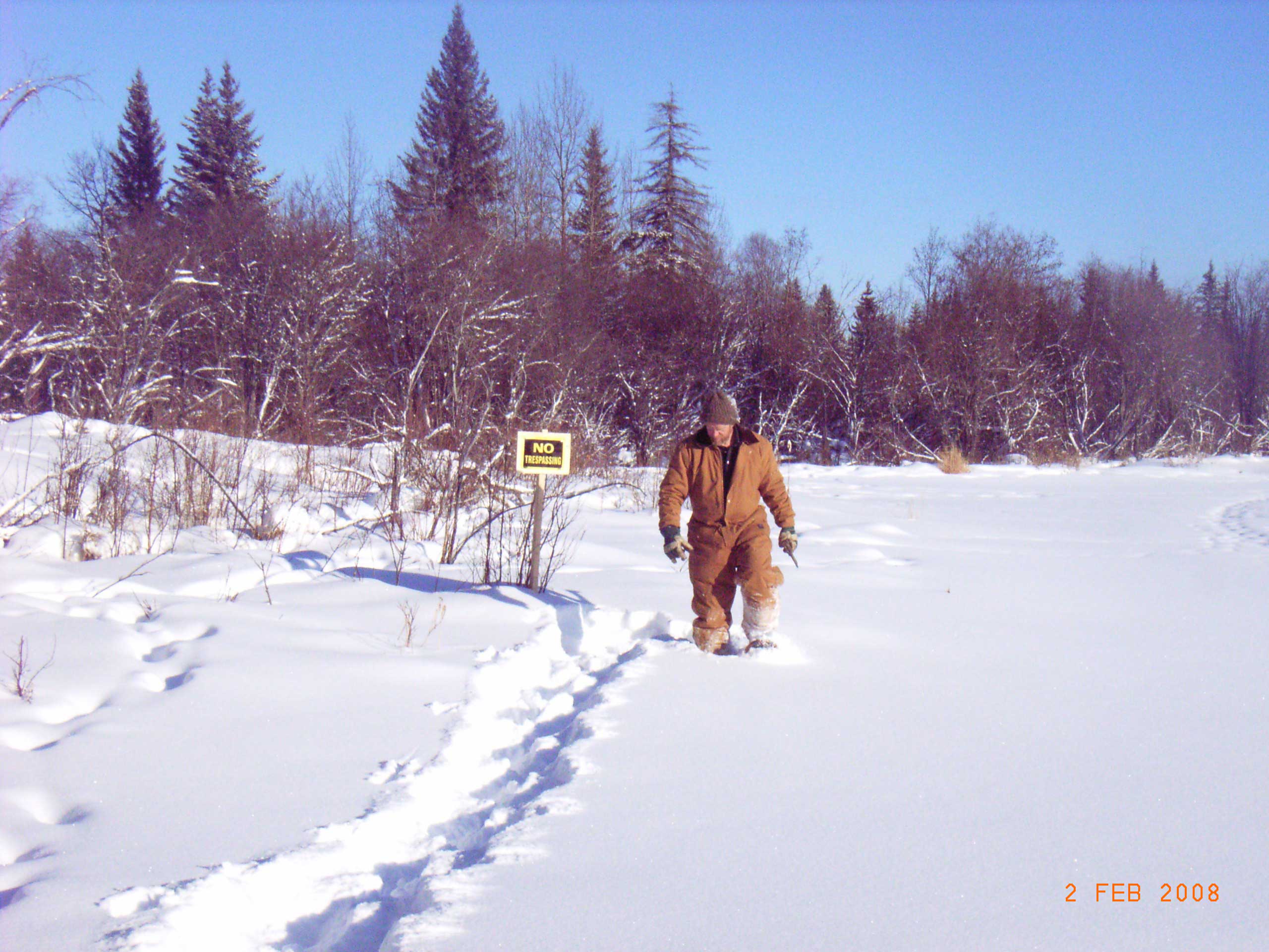 Am letzten Sonntag waren Gereon und ich mal wieder im Schnee unterwegs, er mit Schneeschuhen – ich ohne. Das war etwas bloede von mir. Nun habe ich auch Schneeschuhe. Er hatte allerdings vorher schonmal einen Erkundungsgang gemacht, und wir hatten auch schon Schilder auf dem Biberteich aufgestellt, weil da doch tatsaechlich Skidoo-Fahrer drueber gebrettert waren. Und das geht ja nu nich!