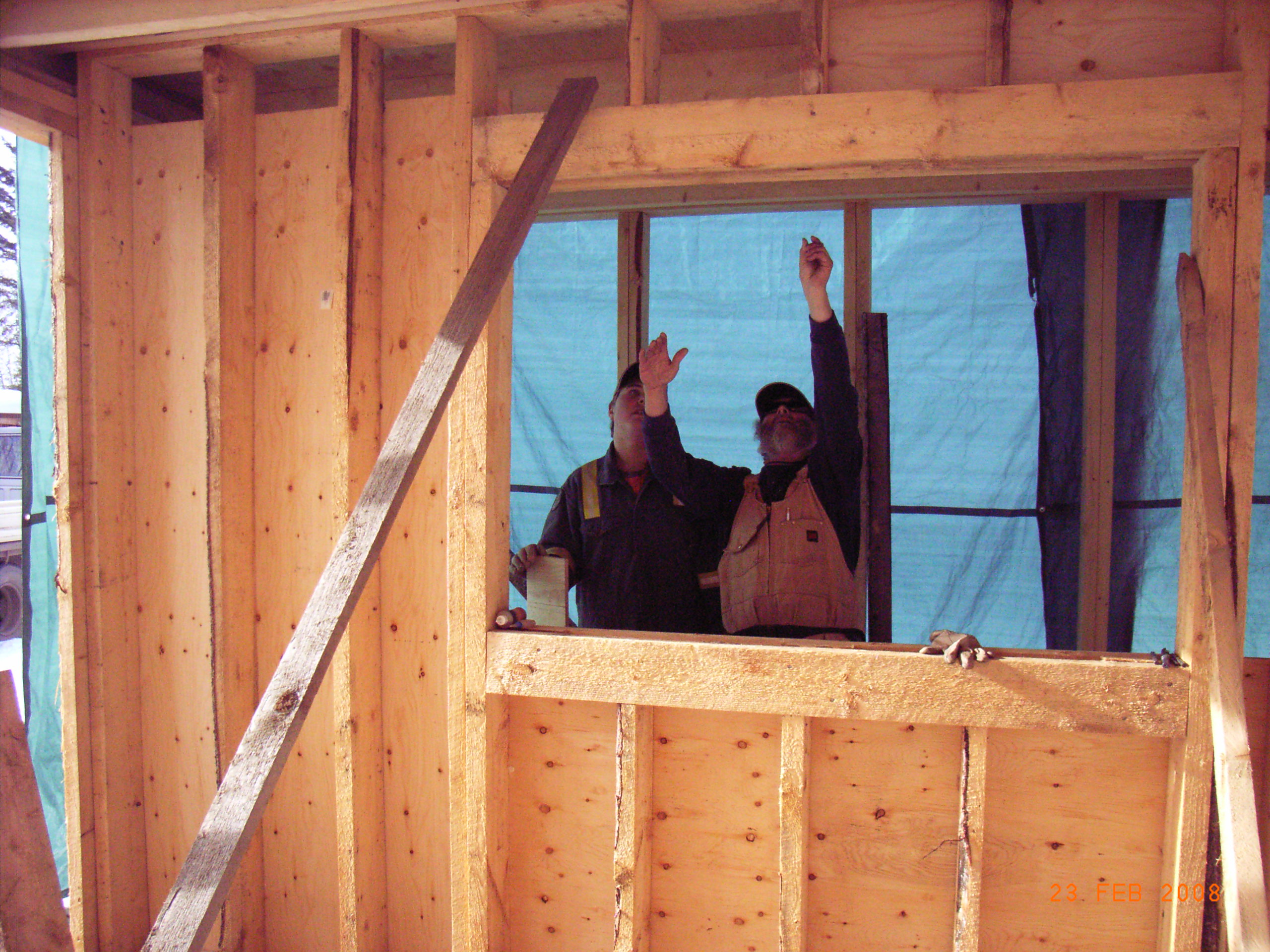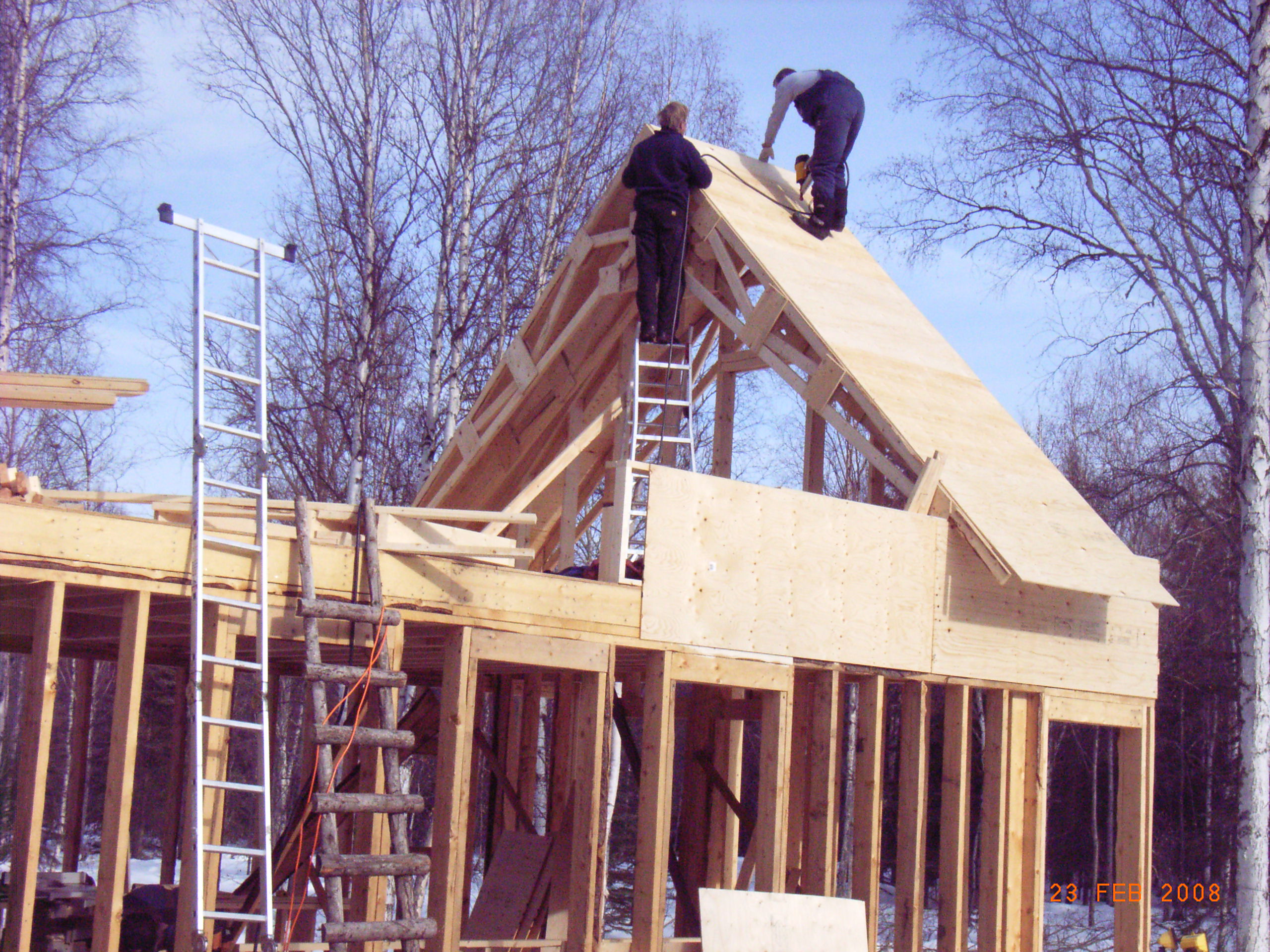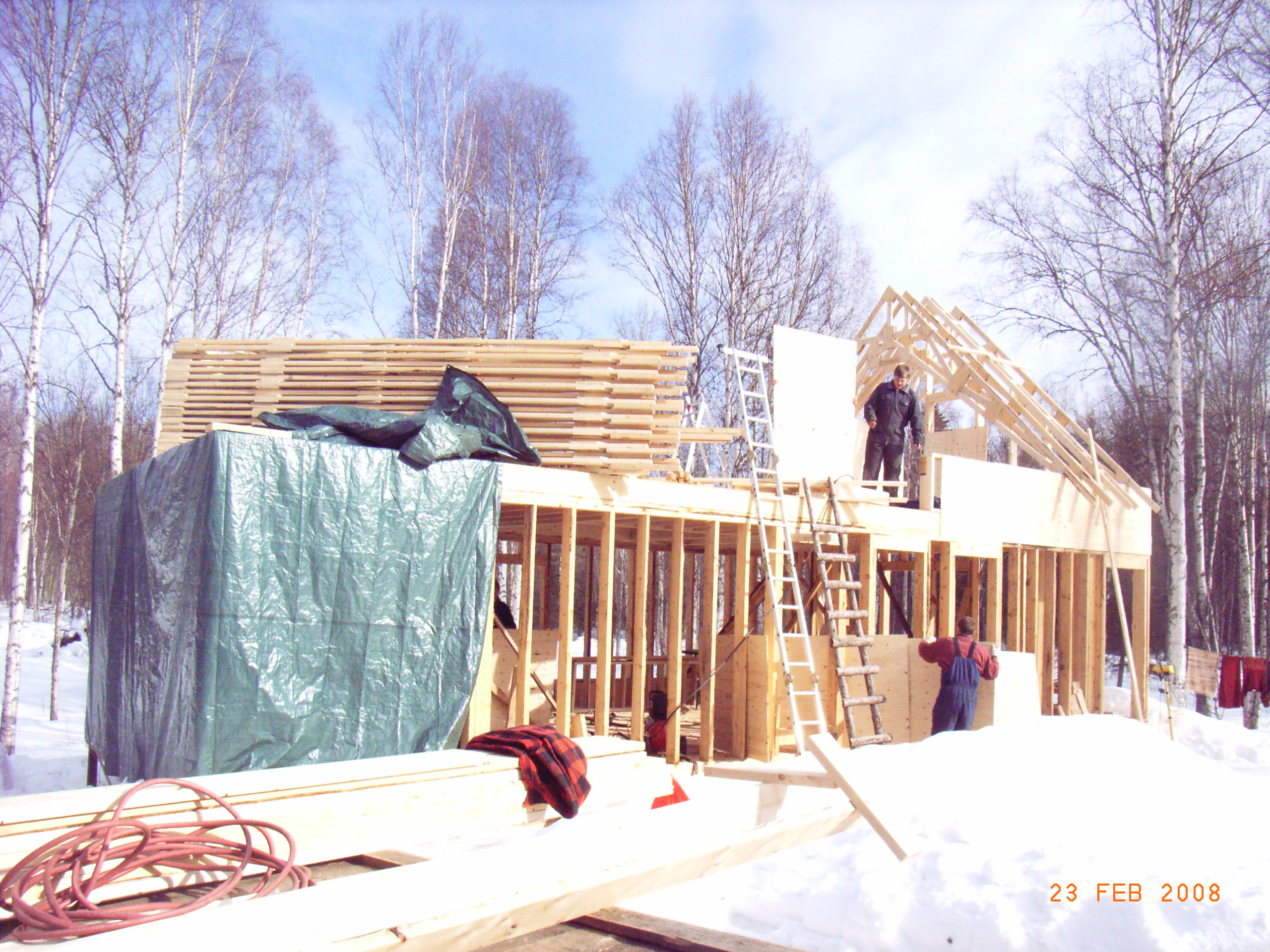 Seit dem letzten Eintrag hat sich das Fruehlingswetter gehalten, Gereon hat fleissig weiter gebaut, und am Freitag reiste Thomas an, um das Dach aufzustellen! Wie schon beim letzten Male, haben die beiden wieder bis in die Dunkelheit gearbeitet, und dann stand die Ostwand. Am naechsten Morgen reisten die restlichen Bussemeier-Maenner an, und dann ging es mit Schmackes weiter. Es wurde gehaemmert und gesaegt und gewuchtet, und manches fand ich ziemlich unheimlich, aber Bjoern sah alles ganz laessig, und am Schluss waren auch alle noch fast heile, bis auf Bjoerns Knie. Waehrend die aelteren Herren oben die Dachbinder rumwuchteten, versteckte sich Norwin unten hinter der Plane, ich wusste gar nicht, warum, bis ich dann zu meiner Freude eine verkleidete Kuechenwand entdeckte. Bin natuerlich versucht, vielleicht ein paar Dekogegenstaende in die Faecher zu stellen, doch die Handwerker raten ab…
