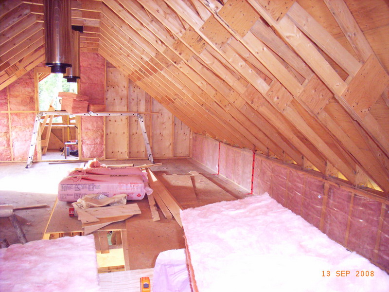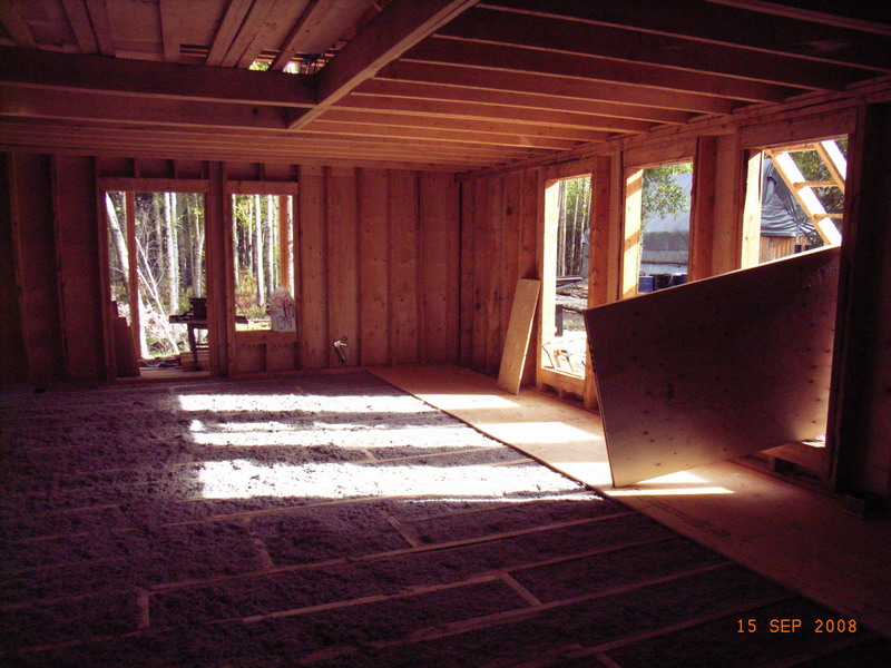 Letztes Wochenende wieder eine Workbee, Thomas reiste dankenswerterweise erneut an, diesmal mit grosser Besetzung, sprich fuenf arbeitswilligen Jungs. Und so wurde ordentlich was geschafft, Isolierung oben angefangen, Unterboden eingebracht, und am Sonntag haben Gereon und ich dann die interessante Zelluloseisolierung reingepustet und Gereon hat die ersten Bodenplatten aufgeschraubt.