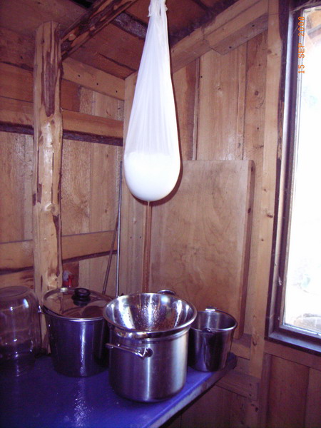 und so quetsche ich ihn in meine Glasschuesseln oder was immer gerade frei ist. Jetzt gibt es immer Pancakes mit „Quark“ und Marmelade – nicht schlecht. Auch einen Fetakaese habe ich produziert, 2 kg, boah! Und schmeckt! Das ganze ist natuerlich zeitlich (und auch logistisch) ein ziemliches Unterfangen. Es ist ja hinlaenglich bekannt, dass unser Teichwasser eine Farbe hat und diese wahrscheinlich auch einen Grund, so dass ich das Wasser nur in den ersten Spuelstadien verwende. Danach muss abgekochtes, zugekauftes, durchsichtiges Wasser verwendet werden. Und das alles dauert gewaltig lange. Und dann die Temperatursteuerung auf dem Holzofen ohne Wasserbad (weil ich mir naemlich einen 20-l-Topf gekauft habe, fuer den ich kein noch groesseres Behaeltnis fand, bis jetzt). Aber weil Debra uns erklaert hat, dass am Schluss auf jeden Fall Kaese rauskommt, bin ich ganz entspannt.