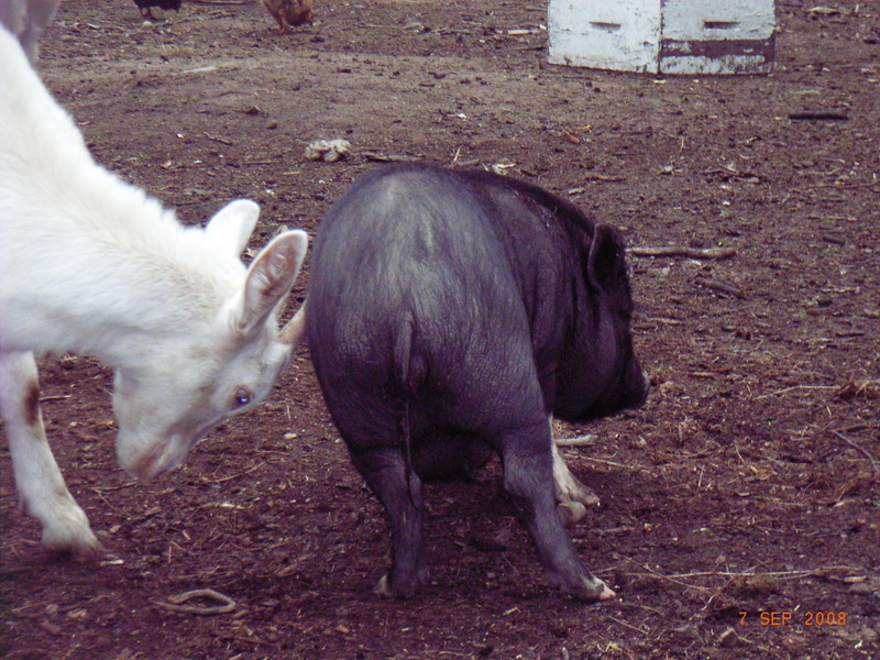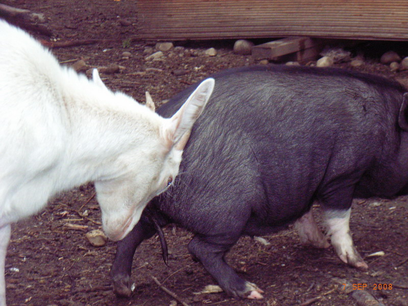 Und dann war da noch Lili, mal wieder rauschig. Sie wird dann in Erwartung interessanter Dinge total malle und ist absolut schmerzunempfindlich (SM unter Schweinen?). Die Ziegen machten sich also einen Spass daraus, mal ein Schwein anzuschieben. Am naechsten Morgen wurde es noch schlimmer, jedoch undokumentiert, als Mafalda sie immer mit voller Wucht an die Hauswand donnerte. Doch was sind schon ein paar Hoernerstriemen auf der Schweineschwarte, wenn man nach Beruehrung lechzt? Na, zum Glueck ist der Rausch erstmal wieder vorbei, ich war wirklich etwas in Sorge. Mafalda naemlich rammt immer gegen Hauswand oder Tuer, wenn sie findet, dass es jetzt Zeit fuer ihr Kraftfutter ist – bis buchstaeblich die Waende wackeln. Das ist dann eine schoene Geraeuschkulisse beim Melken.