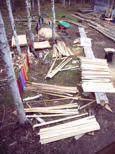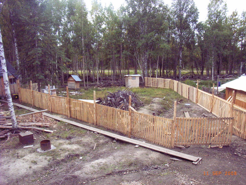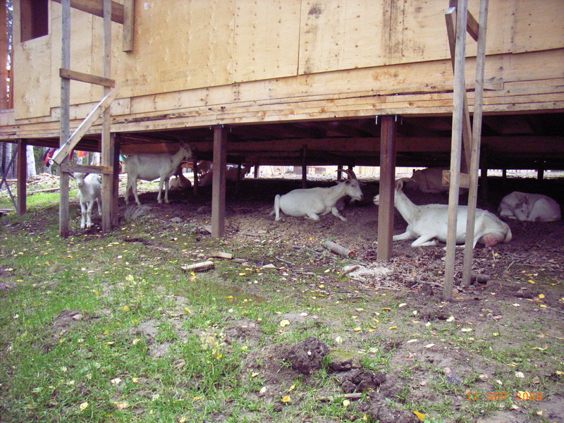 Die Ziegen laufen im Moment viel frei herum, jedenfalls die Damen, damit sie sich jede Menge Futter suchen koennen. Ruhen tut man dann gern im „Keller“. Damit das aber mal wieder kontrollierter wird, saegt Gereon jede Menge Bretter, und daraus haben wir ja schon mit Runas Hilfe angefangen, mehr Gatter zu produzieren. Der neue Ziegenzaun ist begonnen und hier zu sehen – ich glaube, das wird prima.