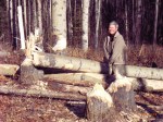 Inzwischen, also einen Tag spaeter, stellen wir fest, dass der Marder sich wie zu Hause fuehlt. Er marschiert fast mitten durch die Huehner, ohne dass diese Naivlinge die Flucht ergreifen. Watch out, Wichtigvogel! Und natuerlich hat Gereon einen Riesenspass damit (wir erzaehlen das den Nachbarn gar nicht, die wuerden sich an den Kopf tippen!). Er fuettert also den Marder mit Schlachtabfaellen auf dem Containerdach, wo sich auch die Grey Jays zu froehlichen Mahlzeiten einstellen. Heute kam er (Gereon) wieder mit der Kamera angerannt, da sass der Marder sehr dekorativ auf einem an der Holzschuppenwand haengenden Elchschaedel. Das Bild ist nur auf Zelluloid, leider. Der Marder wird wohl auch das Tier gewesen sein, dass mich neulich abends anknurrte und mir doch einen Schreck versetzte und Gereon zur Waffe rief.