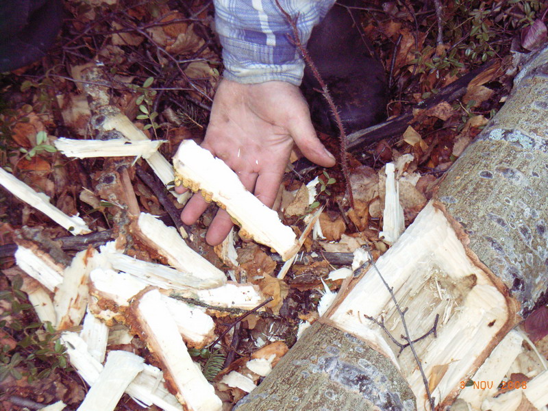 In der Naehe der Biberburg fuehren sie auch ausserdem Baumschnittarbeiten durch. Man konnte erkennen, dass dort offensichtlich schon seit einigen Jahren die Weidenstraeucher regelmaessig gekappt werden. Das „Schnittgut“ wird vor der Biberburg wohl als Wintervorrat gelagert.