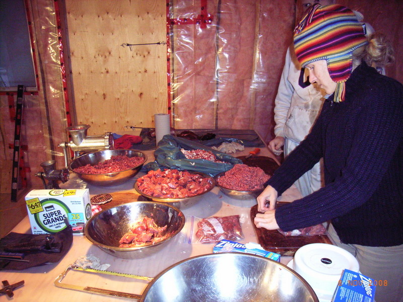 Dieses Wochenende dann wieder die Verwandlung in den Zerlegebetrieb Hoentgesberg, wie das ja im Herbst mal so passiert, ein bisschen Dr. Jekyll und Mr Hyde. Sechs Ziegen weniger muessen nunmehr durch den Winter gefuettert werden, was auch gut ist. Adam und Katrin reisten an und haben mit Gereon den ganzen Samstag umgewandelt, von grossen Stuecken in Stew und Hacke, fleischmaessig kann meinetwegen nun der Winter kommen. Zusaetzlich hat Katrin noch gespuelt wie eine Weltmeisterin, waehrend Adam mit Gereon am Haus gewerkelt hat – ein sehr produktives Wochenende also. Ernaehrt haben wir uns zu einem grossen Teil von Quark in allen Variationen – yumyumyum!!