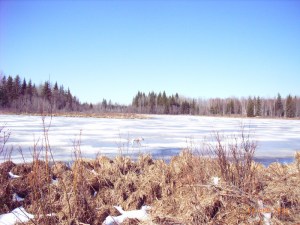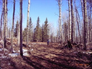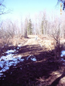 Zu Hause Matsche als erster Eindruck. War mir egal, ich war sowas von muede, wollte nur noch umfallen. Am naechsten Tag sind wir dann aber gleich los, die strassenbaulichen Veraenderungen abschreiten. Sicherheitshalber nahm der Chef eine provisorische Bruecke mit. War auch besser so. Waehrend ich also in Deutschland duschte, wurde der Caterpillar angefahren, und Chris und David reisten fuer ein langes Wochenende an. Ergebnis: Ein Wegenetz von nunmehr ueber 6.4 km, asserdem mehrere Freiflaechen, davon eine fuer die Chef-Cabin am Biberteich. Dort, wo der Chef mit den Brettern wandelt, wird der Lumberyard entstehen, das Saegewerk soll dann da seine Heimat finden. Manche Wegstellen sehen im Moment noch aus wie „richtige“ Strassen, doch ich befuerchte, wenn erstmal der ganze Frost aus dem Boden ist bzw. in Form von Wasser ueber diesen laeuft, werden auch sie sich wieder in Matsche verwandeln.