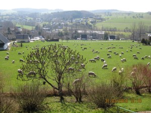 Deutschland also. Ganz schoen viele Autos auf engen Strassen. Dann gleich wieder Regen, und mir schwante schon Boeses. Doch diesmal spielte das Wetter ziemlich prima mit, und ich habe nach fuenf Jahren nochmal einen richtigen Fruehling gesehen, in Oberberg und in Hannover. Und mit Schafen. Und wir haben die Frau Puckendorf besucht, die eigentlich fuer Alter prima aussieht. Dass einem hin und wieder mal die Knochen wehtun, das kann ich nachempfinden. Koennt ihr die Hoechsttemperatur auf dem Thermometer sehen? OK, ein bisschen gefuscht, weil es ja da am Fenster haengt. Aber immerhin „nur“ ein Ostfenster.