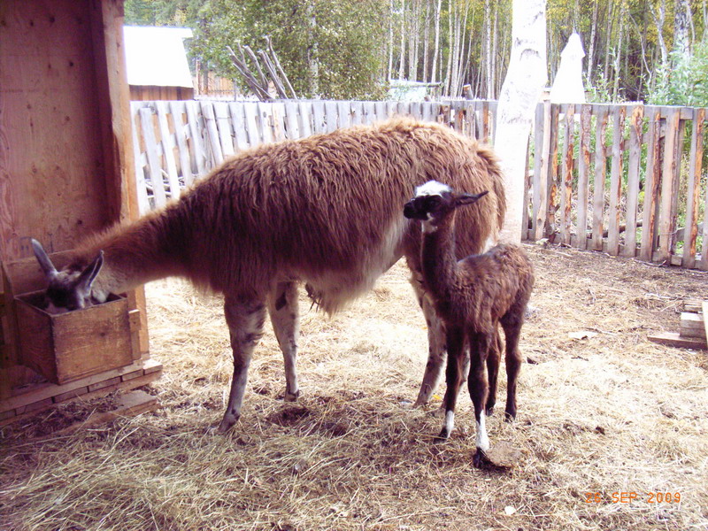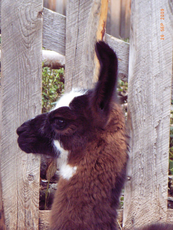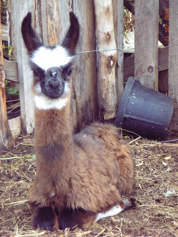 Wer haette das gedacht, dass uns das Lama doch noch ein Baby hinlegt, bzw. hinstellt. Als ich es entdeckte, war es zwar vom Regen nass, aber ansonsten nicht mehr ganz funkelnagelneu, denn es stand und lief. So lotsten wir denn die summende Mutter trickreich mitsamt ihrem entzueckenden Baby in das Ziegengehege, damit sie wenigstens ueber Nacht im Heu unter Dach verbringen konnte. Fand sie nicht so toll, Trennung von den Ziegen findet sie ja immer sehr beunruhigend, da lenkt auch ein brandneues Baby nur voruebergehend von ab. Beim Umzug konnten wir dann auch feststellen, dass es sich um einen kleinen Lamaknaben handelt. Namensvorschlaege, anybody? Hier noch ein paar Nahaufnahmen. Inzwischen sind Mutter und Kind wieder bei der Herde, die sie im gestreckten Galopp umrundet haben. Ganz erstaunlich, was so ein kleines Ding schon fuer eine Koordinationsgabe hat, umso mehr, wenn man sich das Verhaeltnis von Beinen, Koerperhoehe und Hals ansieht.