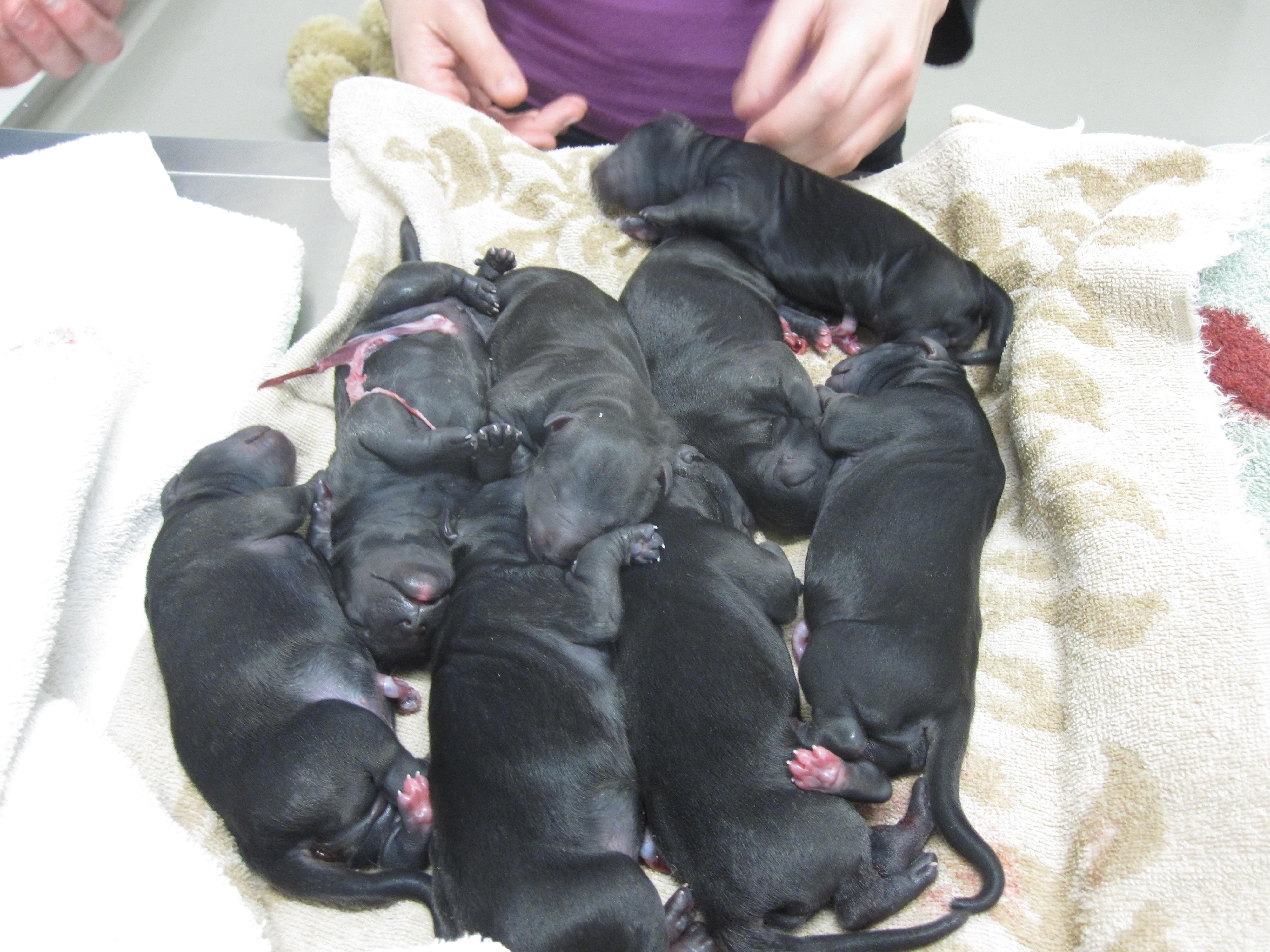 Und so war es dann. Scheidenvorfall aufgrund nicht vorangehender Geburt. Kaiserschnitt. Die Besitzer (und das ist jetzt der zaehneknirschend neutrale Teil) wollten den Hund (18 Monate alt) nach Karlas Diagnose eigentlich lieber einschlaefern lassen. Niemand hatte gemerkt oder auch nur gedacht, dass das Tier traechtig sei, und soviel Geld in einen Kaiserschnitt an einem „Draussen-Hund“ zu investieren, das schien unangebracht. Aber die Tochter hat wohl auf die Traenendruese gedrueckt! Gutes Kind! Und Karla suchte Freiwillige, um die – falls ueberhaupt – ueberlebenden Welpen nach dem Kaiserschnitt zu rubbeln und zum Atmen zu bringen. Die Roentgenaufnahme ergab mindestens 5 Welpen. Raus kamen 8, und nach vereinten Anstrengungen der freiwilligen Puppy Rubber Crew atmeten alle. Da sind sie.