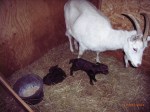 Ich liiiieeebe kleine Ziegen – hatte ich das erwaehnt? Kaum koennen sie stehen, muessen sie auch schon zuckige Bewegungen machen und huepfen (natuerlich mit Umfallen). Odette hat eine neue kleine Gisela und einen dicken Burschen – der hauptsaechlich schon steile Haare macht. Jetzt warten wir nur noch auf Blanca, aber das kann nicht mehr lange sein.
