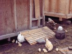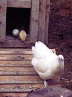 Auch sonst waechst alles. Wenn ich morgens das Tor oeffne, purzeln die Ziegenmuetter mit ihren eifrigen Kindern raus und rennen zum naechsten Futter, und bei den Huehnern ist es nicht anders. Gereons geschaetzte 30 Kueken sind geschluepft, und sie jagen schon Muecken – sehr amuesant. Es wird gerannt und gerast und man kollidiert gern auch mal in der Luft, wenn man sich dasselbe Ziel ausgeguckt hatte. Es scheint, dass Gereons Taktik aufgeht. Er hatte jeweils zwei Hennen zusammen auf etwa 12 Eier gesetzt, und die Eier waren von ihm handverlesen, er hatte nur die groessten ausgesucht. So haben wir von den geschluepften Kueken nur etwa 3 andersfarbige, der Rest ist beige oder weiss (von den Orpingtons naemlich), sie sind alle innerhalb von drei Tagen geschluepft und – oh Wunder – die Muetter vertragen sich alle, die Kueken sehen sich so aehnlich, dass es sowieso hoffnungslos scheint, sich wegen einem zu zanken, man nimmt dann halt das naechste. Und die Kueken nehmen die jeweils naechstsitzende Mutter – sehr praktisch. Fast wie ein Kibbuz oder eine Kommune oder so.
