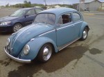 Der Besitzer kam gerade aus dem Laden und so konnte ich erfahren, dass es ein Baujahr 1962 ist, also etwas juenger als mein damaliger Erst-Kaefer, und dass er noch jede Menge VW’s zu Hause hat, u.a. ein Baujahr 1956 (guter Jahrgang!), mit Winkern und Reserve-Umschalthebel. Als ich bemerkte, dass dieser blaue Kaefer aber ja wohl kein Original-Lenkrad habe (es war so ein kleines Rallye-Teil), meinte er, nein, dies sei sowieso kein Originalzustand, nur der Lack sei noch der alte, aber ansonsten handele es sich um ein Go-Fast-Car. Die Raeder z.B. sind von einem Porsche. Als er dann losfuhr, hoerte ich es auch: Ganz eindeutig hatte das mehr als 48 PS unter der hinteren Haube! Aber auch in seinem Kaeferlein war der Ruecksitz rausmontiert. Ob er wohl auch grosse Hunde hatte, wie ich vor ewigen Zeiten?