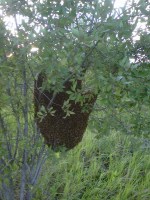 Da hat sich der Chef aber geaergert, dass er nicht noch einen Kasten bei sich hatte! Und ich war ein bisschen stolz, dass ich das so im Vorueberfahren tatsaechlich ohne Brille richtig erkannt habe. Brave Imkersgattin! Also musste er am naechsten Morgen richtig frueh los, diesmal mit Kasten, und hat diesen Schwarm auch einfangen koennen. Macht wohl bis jetzt insgesamt sieben (SIEBEN!!!) Schwaerme. Fuer Zeit und Spritgeld. Nicht schlecht.