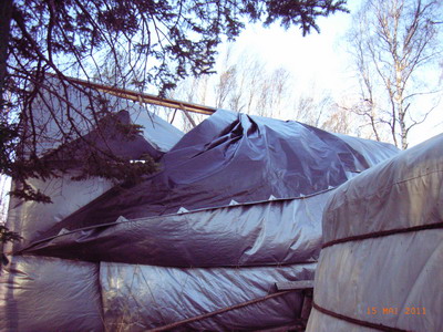 Heute morgen dann, nach einer stuermischen Nacht, das, worauf ich schon lange gewartet hatte. Das Poleshed-Dach flattert froehlich im Wind!