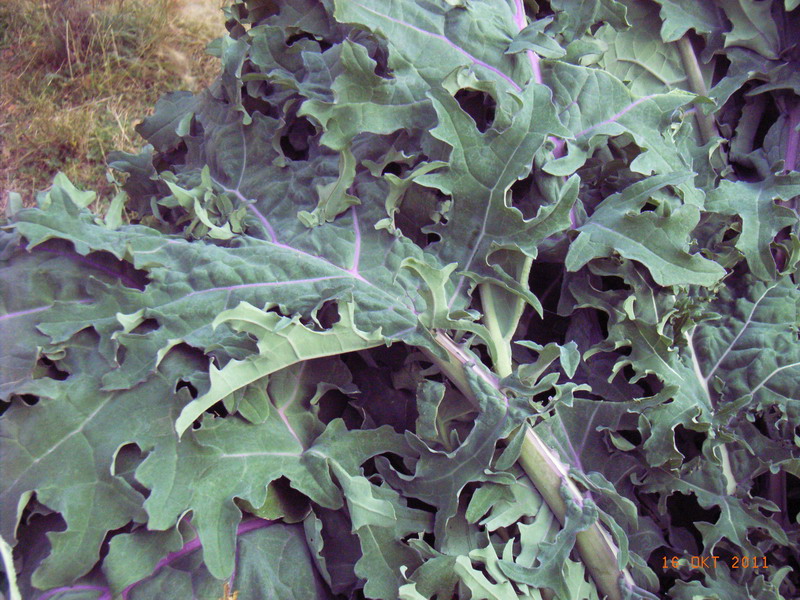 Ich weiss nicht genau, was das ist, es war in einer so genannten Mesclun Salatmischung. Kennt es einer von euch? Dann bitte melden. Es ist etwas Brassica-Verwandtes, schmeckt aber roh milder als der Gruenkohl, den ich vor ein paar Tagen geerntet habe. Mal schauen, wie es sich im Kochtopf bzw. im Wok macht. Aussehen tut es huebsch mit seinen lila Blattadern. Der Sellerie hat natuerlich Frost bekommen wie alles andere auch, aber der wird dann ein bisschen glasig. Ich denke, als Wuerzmittel wird er immer noch gehen.