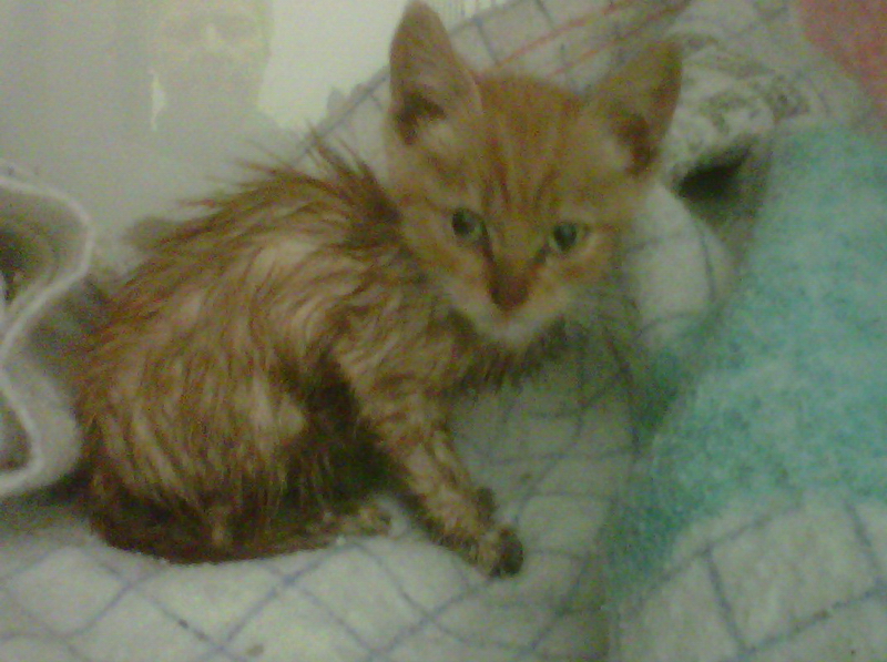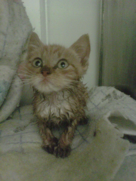 Und dann kam am naechsten Tag dieses Winz-Kaetzchen, das in der Autowerkstatt gefunden worden war. Die Dame, die es ablieferte, hoffte, dass der Chef es als Ergaenzung zum aelter und fauler werdenden, ansonsten aber wunderbaren Werkstattkater uebernehmen wuerde. Das hoffe ich auch! Und habe es erstmal in zwei Badevorgaengen, einmal in Hundeshampoo, das zweite Mal in Spueli, mehr schlecht als recht von seinem Oelfilm befreit. Es kamen tatsaechlich weisse Fuesschen zum Vorschein! Schnurren kann es wie ein Profi.