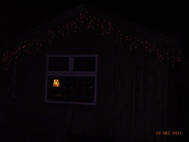 Die Weihnachtlaempchen sind rot! Hatte ich noch nie, aber kamen mit der „Dienstwohnung“. Und weil der Cowboy Jim mir jetzt Strom ins Haeuschen gelegt hat (ein Kabel, mit zwei Verlaengerungskabeln, hoechst zweifelhaft aus der Sicht des Elektrikers, aber ich hab ja nur zwei Gluehbirnen und zwei Netzteile), konnte ich es mir heute nicht verkneifen, die Weihnachtsbeleuchtung einmal anzuschliessen. Ich bin ganz angetan – kitsch as kitsch can, ist ja mal was anderes fuer mich. Und deswegen kriegt ihr das jetzt auch zu sehen, selbst wenn der Gesamteindruck ein bisschen duester ist. Innendrin ist alles hell!