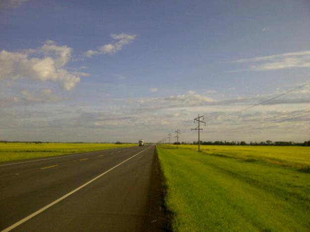 Canola so weit das auge reicht. Die preise sind wohl gut! Die bauern kaufen genetisch modifiziertea saatgut und jede menge pestizide, denn canola kann das aufgrund der modifikation ab. Monsanto verdient zweimal. Und das zeug ist patentiert, die bauern muessen jedes jahr neu kaufen. Von einer bekannte hoerte ich, dass ihr riesenbauer-bruder etwa eine million dollar im jahr fuer kunstduenger ausgibt. Kein wunder, dass hier die devise ist: get big or get out – steig gross ein oder steig aus. Nicht von small is beautiful – kleiner ist klueger…