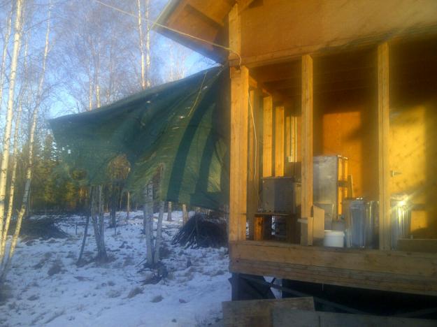 Die inzwischen ueber sechs jahre alte heuplane auf dem planengebaeude haelt wundersamerweise immer noch wind und wetter stand. Wenn die aber mal fliegen geht, wird es hektische betriebsamkeit geben muessen. Immerhin schuetzt sie ein mehr als sechs mal zwoelf meter grosses gebaeude ueber zwei etagen, das voller krams ist, darunter immer noch unausgepackte kisten aus dem container.