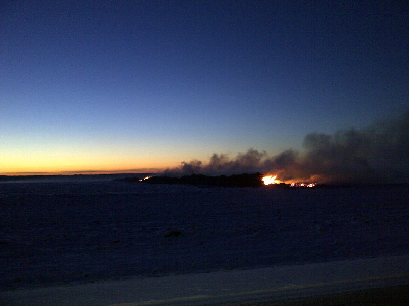 Ab dem 1. November darf in Alberta wieder gezuendelt werden! Ich habe nicht herausfinden koennen, wieviel Land wohl jaehrlich in Alberta abgeholzt und gerodet wird, doch von dem was ich hier sehe, ist es einiges. Und es erscheint mir kaum besser, nein, eigentlich ueberhaupt nicht besser als die Brandrodung z.b. im Amazonas-Gebiet. Hier hatte ich ja gejammert ueber die Methoden der neuen Besitzer suedwestlich von uns. Als ich vor ein paar Tagen abends nach Hause kam, sah das so aus: