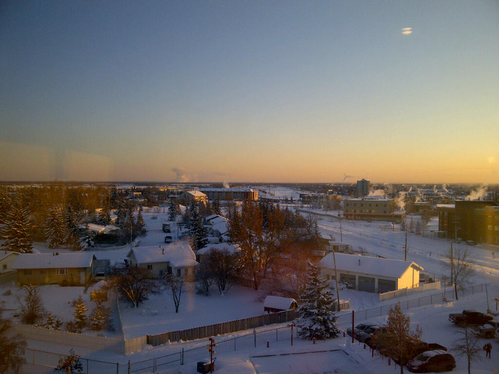 Aus einem krankenhausfenster in grande prairie, wo wir heute leider zu einem ueberraschenden schnellbesuch waren, sieht das so aus. Gar nicht schlimm, oder? Nur nicht so lustig, weil wir wegen des besuches einige stunden aus dem haus waren, so dass es hier bei unserer rueckkehr ziemlich frisch war. Die temperatur haelt uebrigens den chef nicht davon ab, draussen mit kopflampe holz zu hacken, um dann metzger hansens salami „kalt“ zu raeuchern. Ich haette ja sorge, dass sie friert, aber er meint, er schafft das, mit zweimal aufstehen in der nacht. Muss ich diesen mann verstehen? wahrscheinlich nicht.
