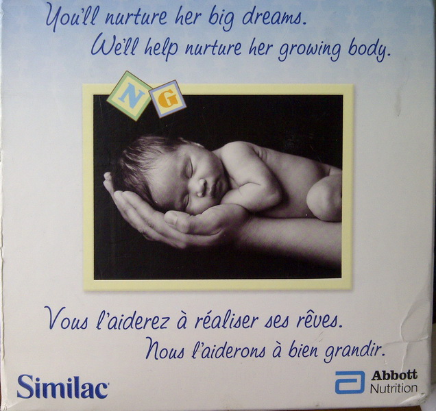Das scheint jedenfalls die Firma zu wissen, die meinem ahnungslosen Mann im Rahmen einer offensichtlich nicht gut organisierten Direktmarketing-Aktion ein Paeckchen mit diesem Foto aussen und zwei Packungen Saeuglingsnahrung innen schickte. Enthalten waren ausserdem Einladungen zu Muetter-Clubs und ein entzueckendes Anschreiben, in dem meinem kinderlosen Mann zu dieser schoensten Zeit seines Lebens gratuliert wird. Tja. Das kommt, wenn man billige Adressen kauft, wahrscheinlich im Dollar Store 😉 Ich guck‘ schon immer, ob er zunimmt…
