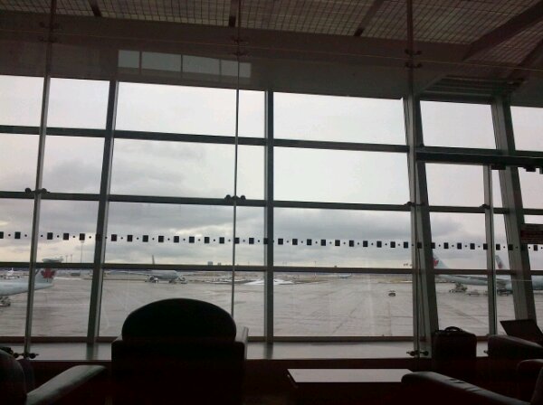 jetzt bin ich wieder in calgary, und das wetter ist sehr aehnlich dem vom 12. maerz in oberberg. immerhin habe ich schon zwei gaense gesehen, und ueber den wolken war es natuerlich wunderschoen. ich konnte mich mal wieder kaum sattsehen an groenland mit seiner teilweise bizarren schnee- und eislandschaft. erstaunt war ich darueber, wieviel offenes wasser es zwischendurch, also zwischen groenland und baffin island, schon gab, obwohl die anzeige eine viel noerdlichere route angab als auf dem hinflug. weil alles so gleichmaessig weiss ist und keinerlei anzeichen menschlicher ansiedlungen zu sehen sind, kann ich mir gar nicht vorstellen, wie gross das wohl alles ist. aber von oben sieht es so aus, als ob ich da gern mal mit einem hundeschlitten drueberzischen wollen wuerde. hier auf dem flughafen fahren die ganze zeit riesige schneekehrmaschinen rum, aber eigentlich sieht alles nur nass aus. immerhin sehe ich jetzt downtown calgary, beim landeanflug ging es nur durch dichte wolken, aus denen wir erst herauskamen, als wir unmittelbar ueber der landebahn waren. und nun latsche ich wieder los, einmal mehr durch den sicherheits-check und um halb sieben ab nach grande prairie. dann noch anderthalb stunden flug und knapp zwei stunden autofahrt… sunset house ist wirklich nicht mal gerade um die ecke. jetzt freue ich mich auf zuhause, mein bett, die stille (hier plaerren hits aus den siebzigern und achtzigern aus den lautsprechern…) – und morgen frueh hoffentlich wieder tee im bett.