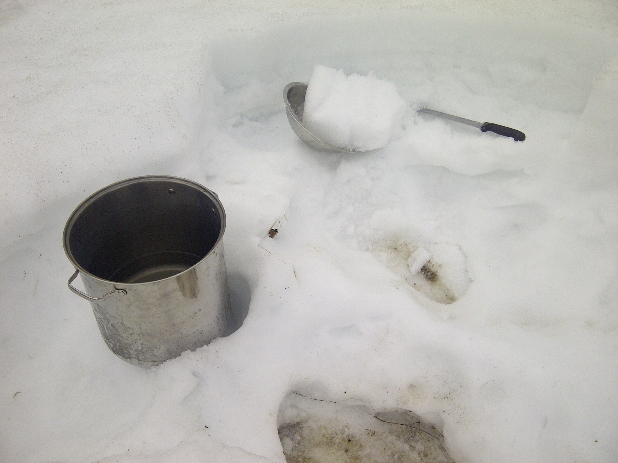 Die Gewinnung von Brauchwasser tritt mal wieder in ihre „interessante“ Fruehlingsphase: Der Schnee sackt zusammen, was ihm pro Kubikmeter sicher mehr Wassergehalt gibt. Gleichzeitig aber kann man ihn nicht mehr so einfach mit der Schuessel in den Topf schaufeln. Also schneide ich ihn mit einem grossen Messer in Quader. Und weil schon bald Mai ist, muss ich immer weiter laufen, um einigermassen sauberen Schnee zu finden. Es ist erstaunlich, was so alles aus den Schornsteinen rausfliegt – der Schnee bzw. die wenigen Schneereste direkt vorm Haus haben eine Russschicht, haesslich.