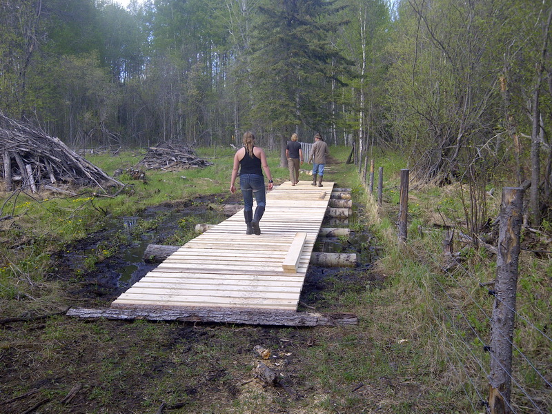 Die Bruecke ist fertig. Ich plaediere jetzt noch fuer Riesen-Stempelkissen an beiden Enden, damit wir auch sehen koennen, wer alles darueber marschiert, aber das wird wohl nicht genehmigt werden. Und natuerlich hat Sonja recht mit ihren Anmerkungen: Bei Vermietung waere es vorbei mit der Idylle. Ich vermute aber, dass sowieso kaum eine echt kanadische Braut Moskitomusik zur Hochzeit wollte. Hochzeiten sind hier doch eher eine grosse, pompoese Angelegenheit. Ich werde die Bruecke weiter ueberwiegend fuer mich haben und den Blick ins Wasser und in den Himmel geniessen. Allein. Gut so.