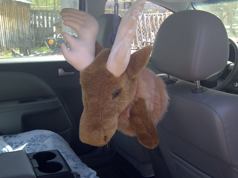 Freund Walter (Schmitten im Hochtaunus, derzeit Grande Prairie) mag es Kanadisch, und so ziert schon laenger diese nicht winzige Elch-Handpuppe sein jeweiliges Fahrzeug. Bei seinem Wochenend-Besuch berichtete er, dass er neulich morgens, so gegen 6:35 Uhr, in Grande Prairie zur Arbeit fuhr, korrekt knapp unter 50 in der Stadt, weil er wusste, dass an der Stelle, die er passierte, haeufig die Polizei mit dem Radargeraet stand. So auch an diesem Morgen. Walter pruefte kurz den Tacho, alles im gruenen Bereich! Im Rueckspiegel sah er, wie einer der Polizisten zu seinem Auto rannte und losfuhr, und Walter vermutete, dass der nach ihm Fahrende wohl zu schnell gewesen sein musste. Gross war sein Erstaunen, als ihm ein weiterer Blick in den Rueckspiegel deutlich machte, dass das Blaulicht-Feuerwerk ihm galt. Er fuhr rechts ran, der Polizist stieg aus, kam flott zum Auto marschiert, guckte auf den Ruecksitz – und schlug mehr oder minder gackernd die Haende ueber’m Kopf zusammen. Im Gespraech klaerte sich, dass der Mann geglaubt hatte, in dem vorueberhuschenden Autofenster einen Menschen zu sehen, der auf der Rueckbank lag und mit Handschellen irgendwo ueber’m Fenster angetackert war… Walter wunderte sich nicht schlecht, aber er verkniff sich, den Polizisten nach dem Grund fuer die bereits am fruehen Morgen aufgesetzte dunkle Sonnenbrille zu fragen. Man lachte froehlich noch ein bisschen weiter, und dann meinte der Polizist, wo man nun schon einmal am Rand geparkt sei, wolle er doch auch gleich mal Walters Papiere ueberpruefen. Das war schade. Walter fuhr naemlich ohne, und sein Fuehrerschein, den er gar nicht dabei hatte, war sowieso abgelaufen. (Dazu muss man sagen, dass das nicht Walters Verschulden war, sondern eine weitere kanadische Behoerdenmerkwuerdigkeit und eine andere laengere Geschichte.) Auch die Anmeldung und die Versicherungspapiere lagen sicher bei Walter zuhause. Zwar liess sich der Polizist davon ueberzeugen, dass es all diese Papiere gibt (er war naemlich, wie sich herausstellte, deutscher Abstammung und mit einer Europaeerin verheiratet, man hatte also viel Gespraechsstoff), aber er folgte Walter dennoch bis zu dessen Arbeitsstelle, um die Angaben zu ueberpruefen – und schrieb ihm einen Bussgeldbescheid ueber $171! Teure Elch-Fahrt. Der Elch sitzt jetzt mitten auf der Rueckbank, in der Aussparung fuer die herunterklappbare Armlehne.