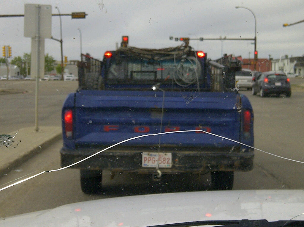 Leider durch die frontscheibe (ja, sie hat einen sprung, ich weiss) und unscharf. Der fahrer ist ein durchaus alter mann, der ueber den sears-parkplatz humpelte, dann aber mit schwung vor mir her fuhr. In seinem verbeulten, mit rolle oder pinsel gestrichenen uralt-ford, der hinten gitteraufsaetze hat, ausserdem eine hinter dem fuehrerhaus eingehaengte winde, die anscheinend die heckklappe haelt. Sicherheitshalber sind um das gestell hinterm fuehrerhaus noch seile, ketten und drahtseile gewickelt – you never know, eh? In einem rohr an der box hinten links steckt eine axt. Beim deutschen tuev wuerden sie gleich herpes kriegen, ich bin sicher!