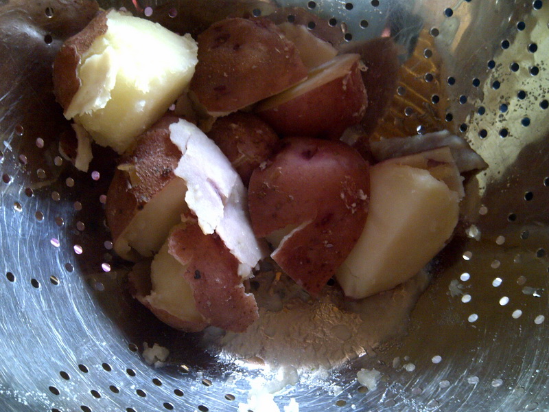 Warum ist es wohl, dass ich auch nach zehn Jahren nicht in der Lage bin, „normale“ kanadische Kartoffeln so zu kochen, dass sie zwar gar, aber am Stueck sind? Die oben abgebildeten Matschteile waren aussen, na ja, wie man sieht, und innen teilweise knackig. Sowieso ist die Kartoffelphilosophie hier eine ganz andere als in Oberberg: Wenn man die Sortenbeschreibungen nachliest, dann gibt es Bakers, Mashers, Boilers etc.pp., die angeblich alle unterschiedliche Kocheigenschaften haben. Fuer mich erweisen sie sich immer als mehlig, mehlig oder mehlig. Und schoene, gelbe Kartoffeln muss man mit dem Navi suchen.
