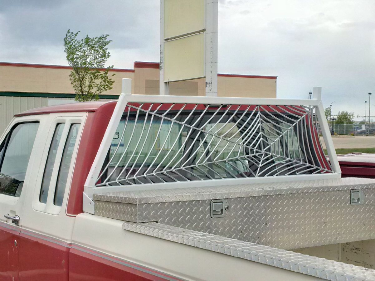 So nennt man das hier, dieses Gitter, das irgendwelche Ladungsteile daran hindern soll, beim Bremsen dem Fahrer durch die Scheibe an den Kopf zu hauen und somit Headache, Kopfschmerz zu verursachen. Bei diesem alten Ford Pickup, gerade in Grande Prairie entdeckt, war mal jemand kreativ! Und sind die hinteren Seitenscheiben nicht schick?