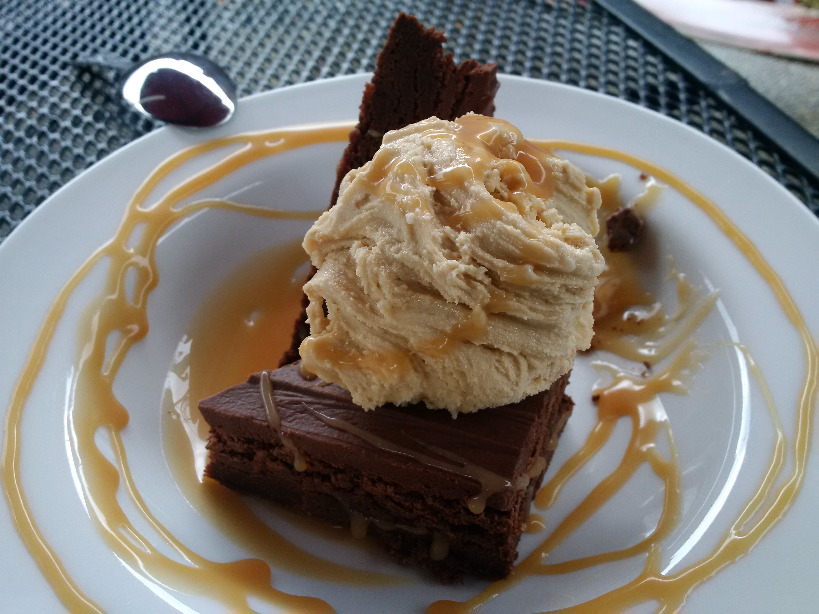 Double-Chocolate Brownie mit Meersalz-Karamel-Gelato in Falkland (wo es auch eines der aeltesten Rodeos Kanadas gibt und wo es mir ziemlich gut gefiel).