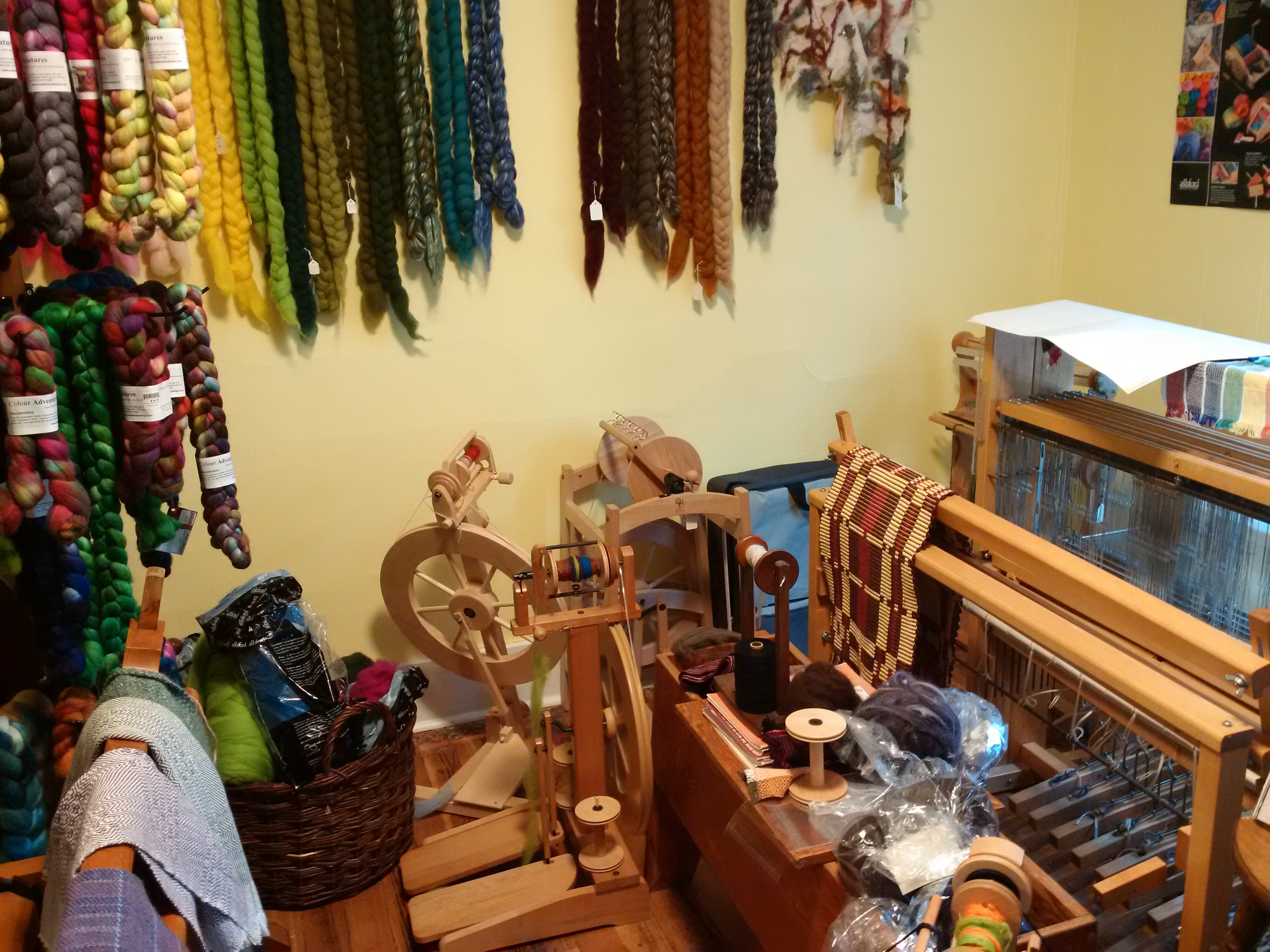Paradiesisch – der Spinn- und Filzraum. Auf meine Anfrage wurde mir sofortissimo ein schoenes Spinnrad fuer eine „Testfahrt“ zur Verfuegung gestellt. Grosser Spass!